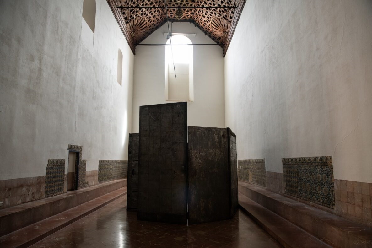 La elección del Refectorio del antiguo monasterio como espacio expositivo añade nuevas capas de lectura a la instalación. Este ámbito, originariamente utilizado como comedor monástico, fue construido en el siglo XVI y destaca por su imponente artesonado de madera de 1588, realizado por Diego Cerezo y Lucas de Cárdenas. Restaurado entre 1971 y 1978 por el arquitecto Rafael Manzano, el Refectorio se integra en la actualidad como uno de los principales espacios del conjunto histórico destinado a exposiciones temporales, reforzando la vocación del CAAC de activar el patrimonio arquitectónico como soporte para nuevas lecturas del arte contemporáneo.