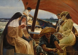 En los museos andaluces se puede seguir esta evolución del veraneo a través de, por ejemplo, ‘Escena de celebración nocturna con barcas”, un lienzo de finales del XIX del gaditano Salvador Viniegra, que se conserva en el Museo de Cádiz y donde se aprecia la influencia de Fortuny y José Villegas. Otro de sus lienzos más conocidos, ‘La vendimia’, muestra, en cambio, cómo la mayor parte de los andaluces de la época pasaban el verano en el campo. Esas diferencias sociales las pondría en evidencia en un solo golpe de vista Rafael Hidalgo Caviedes en ‘Contrastes’, un lienzo de 1907, ubicado en el Museo de Jaén, que contrapone a humildes marineros frente a los burgueses y monjas que viajan en una embarcación.