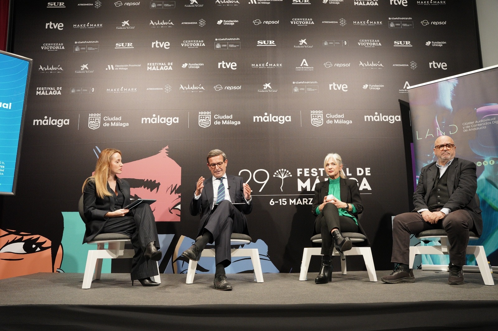 La consejera de Cultura y Deporte, Patricia del Pozo, y el consejero de Industria, Energía y Minas y presidente de la Agencia Digital de Andalucía (ADA), Jorge Paradela, han presidido esta tarde la tercera reunión del Clúster Audiovisual y de Contenidos Digitales de Andalucía (LAND), celebrada en el marco del Festival de Málaga, durante la cual han dado a conocer las medidas impulsadas por la Junta “para fortalecer y consolidar el sector audiovisual y de contenidos digitales en Andalucía, entre las que se encuentra un ambicioso plan de incentivos, el mayor de su historia reciente, así como la puesta en marcha del Punto Único de Información”, han señalado los consejeros.
