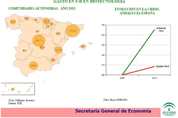 El gasto en actividades de I+D interna en biotecnología en Andalucía se cifró en 2013 en 164,9 millones de euros, siendo la tercera comunidad con mayor nivel, tras Cataluña y Madrid. Respecto al año anterior, el gasto en este tipo de actividades se incrementó un 7,5% en Andalucía, lo que contrasta con el comportamiento observado en el conjunto nacional, donde cayó un 1,8%.