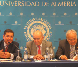 Gaspar Llanes, secretario general de Economía; José Guerrero, vicerrector de la Universidad de Almería; y Alfredo Martínez, director del curso inaugurado hoy.