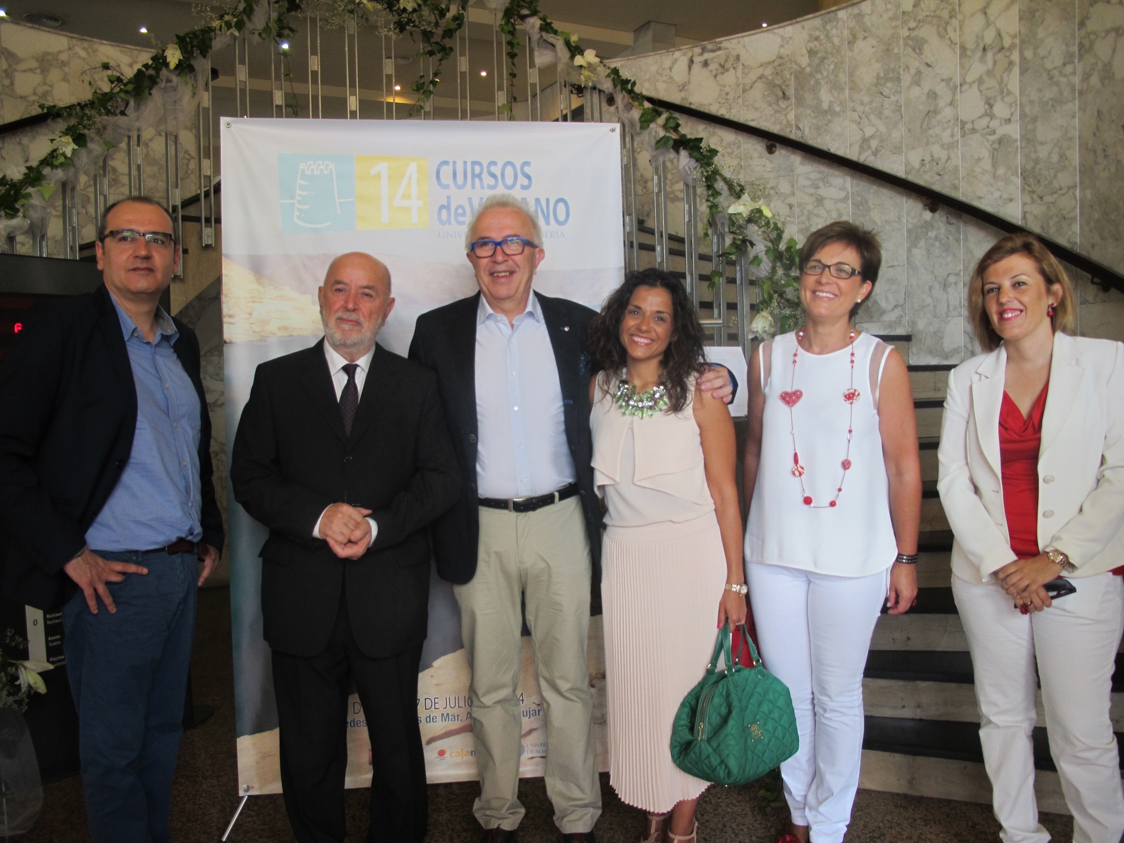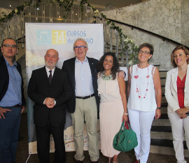 El consejero de Economía, Innovación, Ciencia y Empleo, José Sánchez Maldonado, junto al rector de la Universidad de Almería, Pedro Molina; la delegada territorial de Economía, Innovación, Ciencia y Empleo, Adriana Valverde; la delegada del Gobierno andaluz en Almería, Sonia Ferrer, y los directores del curso de verano.