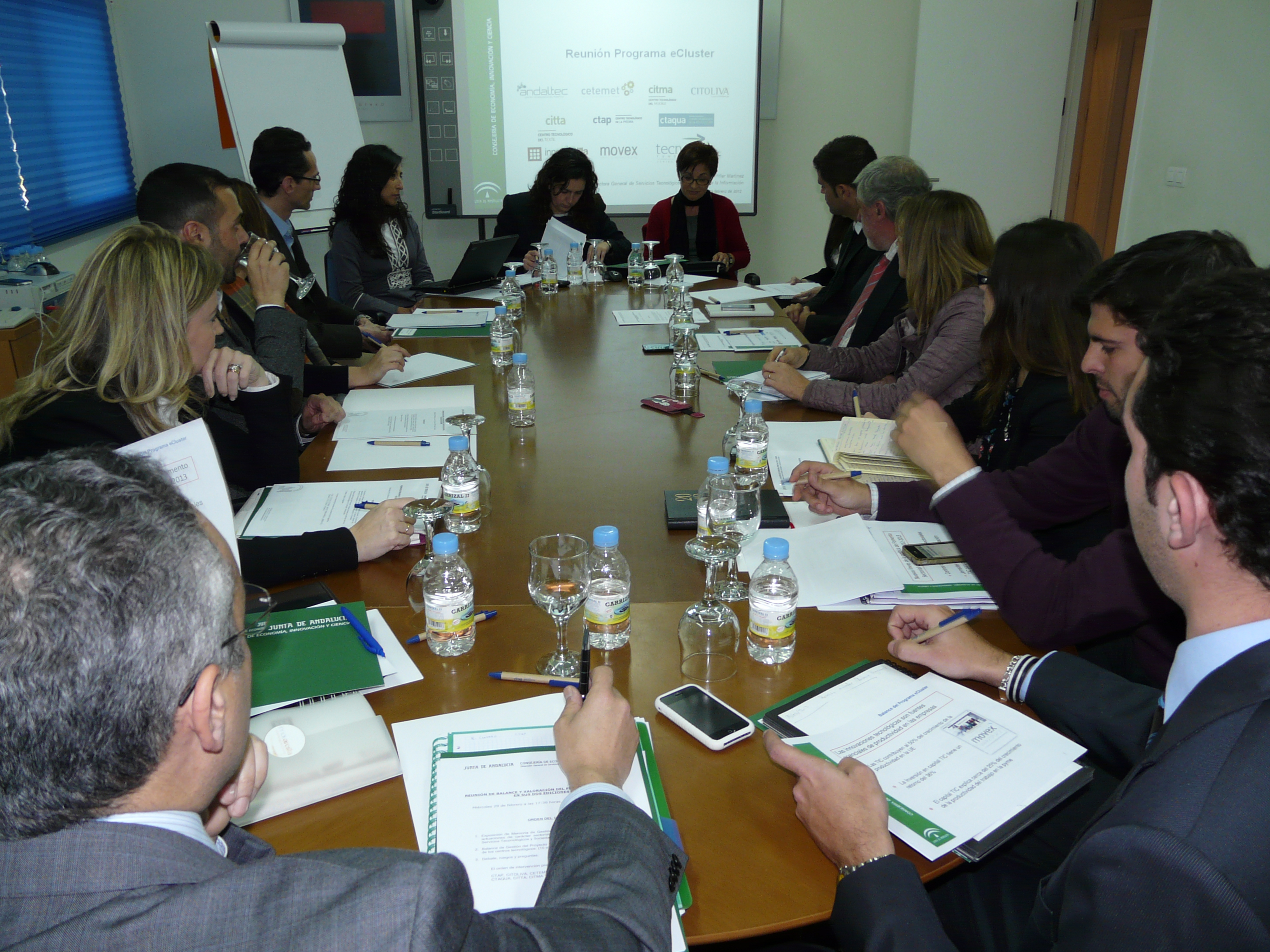 En la reunión han participado los gerentes de los diez Centros Tecnológicos que han participado en el programa eCluster: Centro Tecnológico del Plástico (ANDALTEC), Centro Tecnológico Metalmecánico y del Transporte Terrestre (CETEMET), Centro Tecnológico de la Madera y el Mueble de Andalucía (CITMA), Centro Tecnológico del Olivar y del Aceite (CITOLIVA), Centro Tecnológico del Textil de Andalucía (CITTA), Centro Tecnológico de la Piedra (CTAP), Centro Tecnológico Acuicultura de Andalucía (CTAQUA), Centro Tecnológico de la Arcilla (INNOVARCILLA), Centro Tecnológico de la Piel de Andalucía (MOVEX) y Centro Tecnológico de la Industria Auxiliar de la Agricultura (TECNOVA).