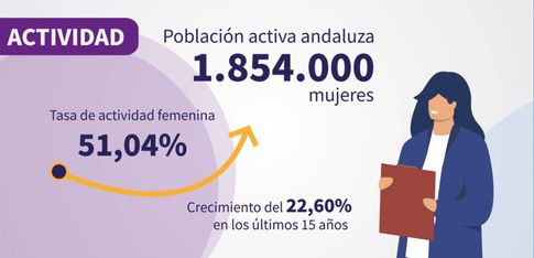 Analizando la participación de la mujer en el mercado laboral andaluz, el informe apunta que la población activa andaluza (mujeres de 16 o más años que trabajan o desean hacerlo) asciende a 1.854.000 mujeres y la tasa de actividad femenina (indicador que define el número de personas de 16 años o más que trabajan o desean hacerlo entre el total de personas de ese intervalo de edad) se sitúa en el 51,04%. Pero, a pesar de que la población activa femenina ha crecido un 22,60% en los últimos 15 años, su participación en el mercado laboral sigue siendo menor que la de los hombres.