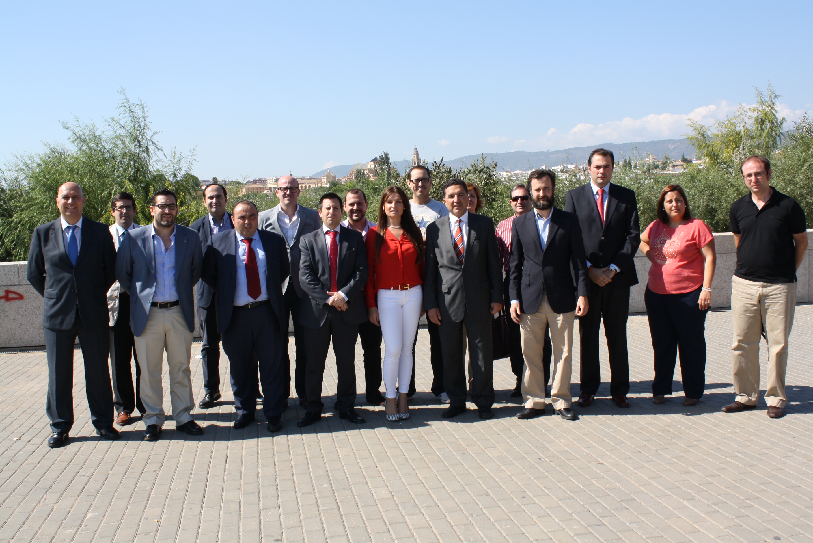 En el centro el delegado de Economía, Innovación, Ciencia y Empleo, José Ignacio Expósito, la presidenta de AJE Córdoba, Mari Sol Chacón, y el secretario general de Economía, Gaspar Llanes, junto con el grupo de empresarios con quienes han mantenido el encuentro.