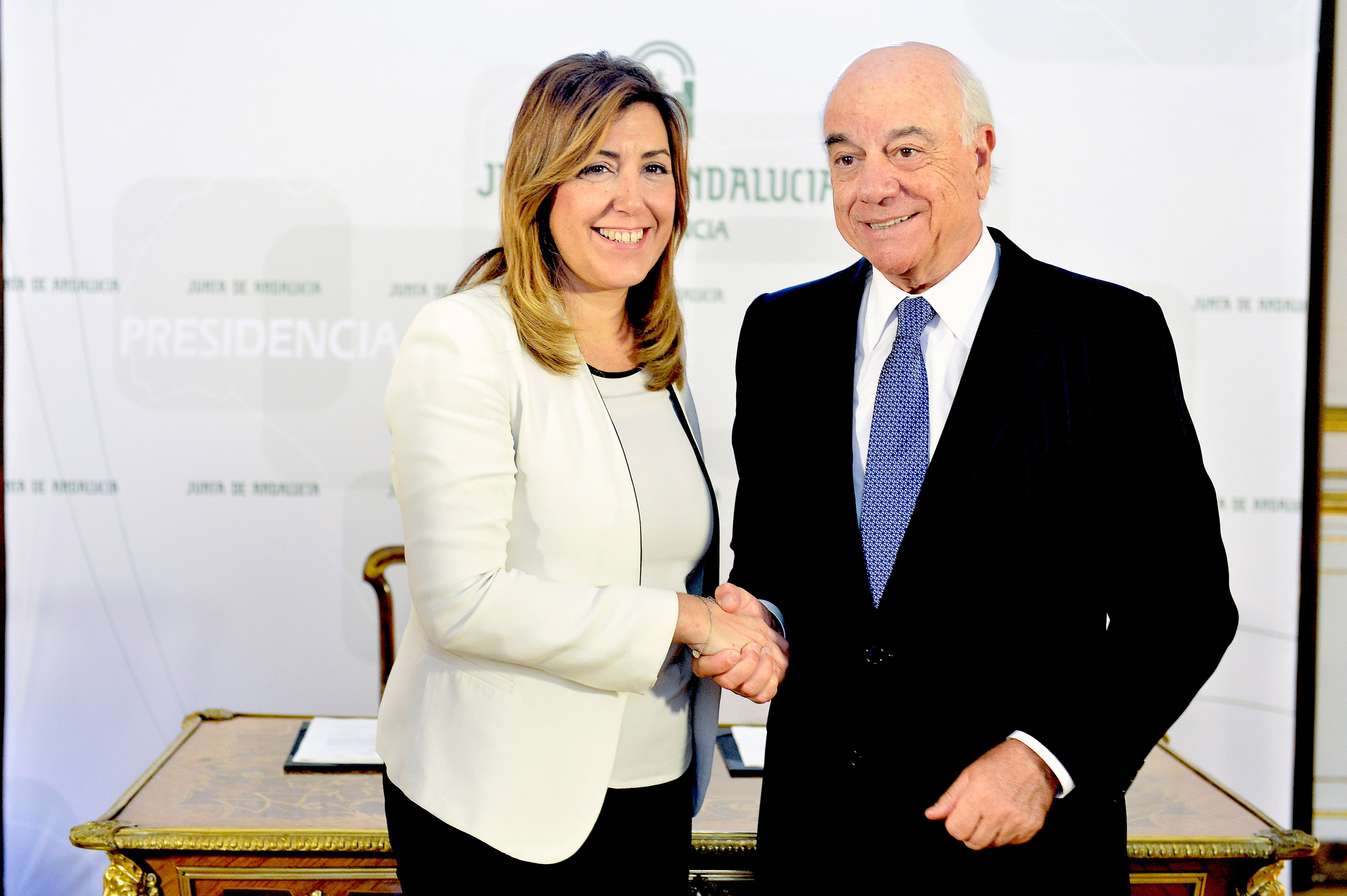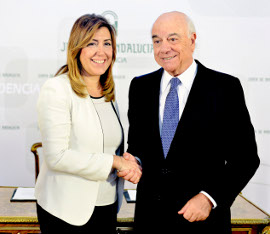 La presidenta de la Junta de Andalucía, Susana Díaz, y el presidente del Banco Bilbao Vizcaya Argentaria SA (BBVA), Francisco González, han firmado en San Telmo un convenio de colaboración por el que la entidad bancaria se compromete a impulsar una línea de financiación, dirigida a emprendedores y pequeñas y medianas empresas andaluzas, por un importe de 500 millones de euros. Con esta iniciativa, la Junta pretende facilitar crédito a las pymes andaluzas y propiciar la creación de empleo en sectores estratégicos. Al acto ha asistido también el consejero de Economía, Innovación, Ciencia y Empleo, José Sánchez Maldonado.