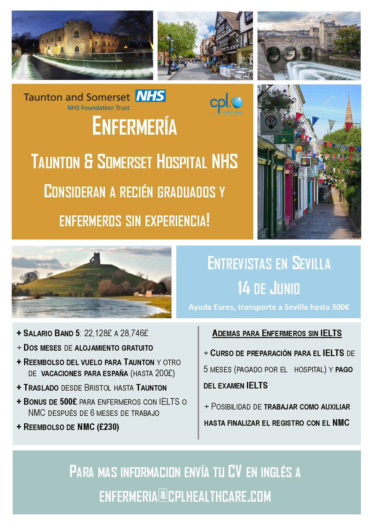 La Red EURES informa sobre un nuevo proceso de reclutamiento de personal de enfermería para trabajar en el hospital público del National Health Service ( NHS ), en las zonzas de Taunton y Somerset. Esta oferta está gestionada por la agencia de empleo irlandesa, CPL Healthcare, especializada en el sector de la salud.
