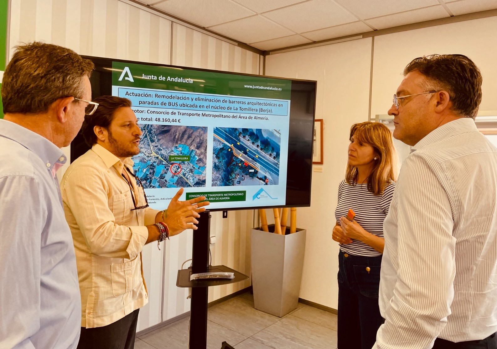 La delegada territorial de la Consejería de Fomento, Articulación del Territorio y Vivienda en Almería, Dolores Martínez, el alcalde de Berja, José Carlos Lupión y el director gerente del Consorcio de Transporte Metropolitano del Área de Almería (CTAL), Luis Miguel Carmona, han presentado oficialmente el proyecto de remodelación de la parada del barrio de La Tomillera de Berja.