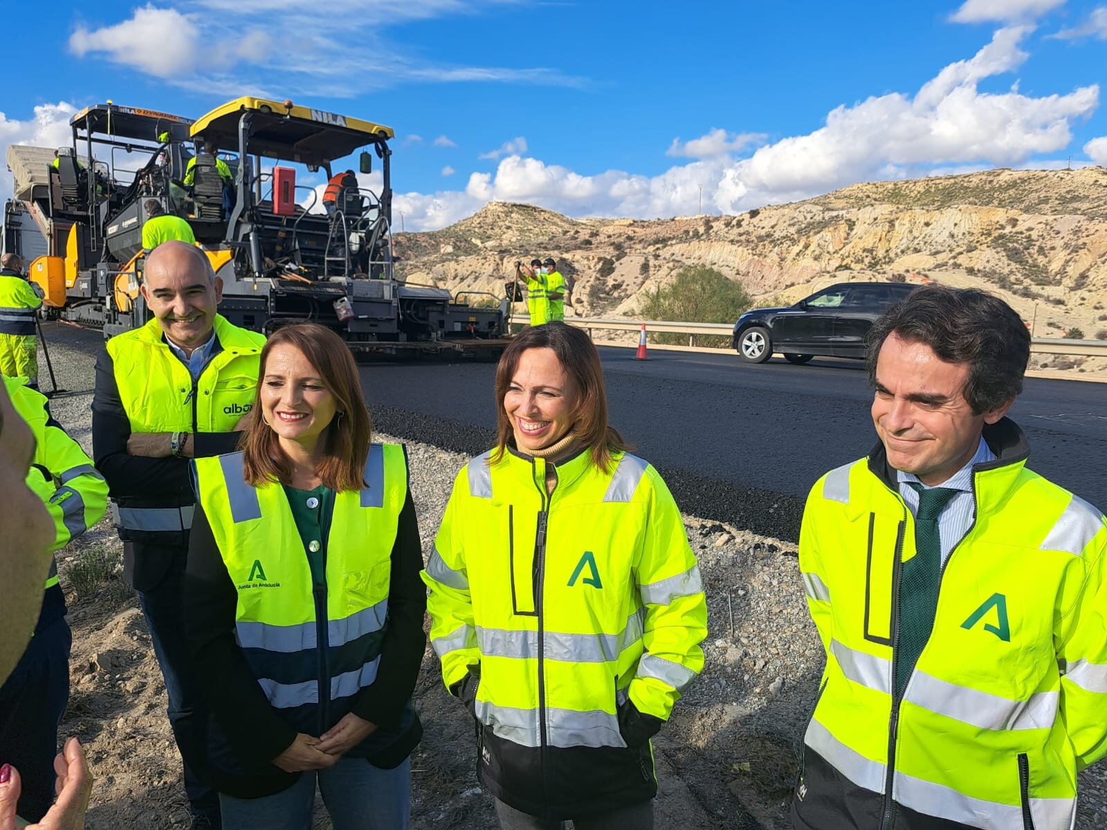 La consejera ha asistido a estas pruebas asfálticas junto a la alcaldesa de Albox, María del Mar Alfonso; el viceconsejero de Fomento, Mario Muñoz-Atanet; el director general de Infraestructuras Viarias, Alfonso Lujano; la delegada territorial de Fomento, Dolores Martínez; y los directivos del comité ejecutivo de Cosentino Valentín Tijeras (VP.Producto / I+D) y Ángel Madariaga (VP Ingeniería & Proyectos).