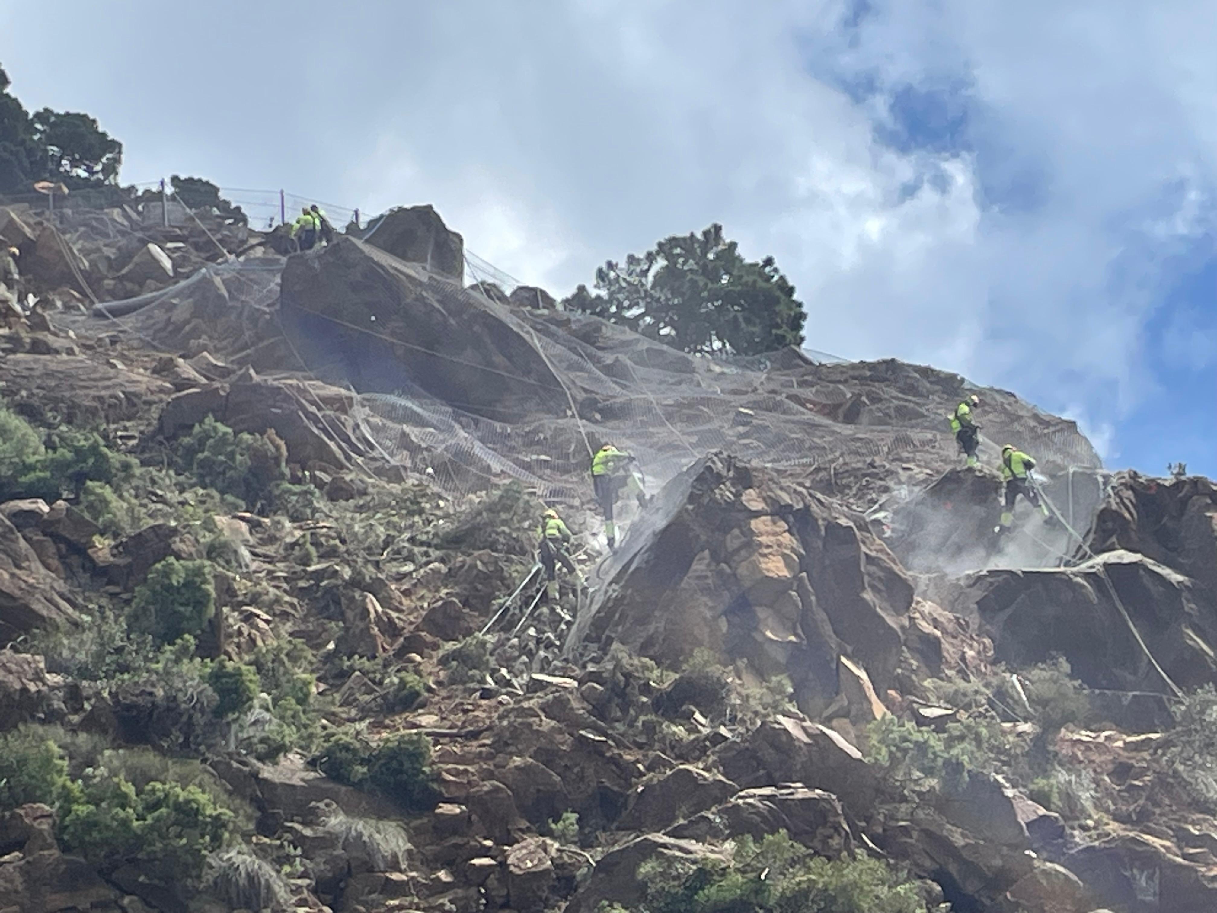 Esta obra de emergencia se está desarrollando en fases. Una vez que se finalicen las tareas de saneo y limpieza de bloques en la zona inestable, se realizará una protección parcial y se retirarán bloques que se han considerado potencialmente inestables. Tras ello, se ejecutará una nueva pantalla dinámica de protección contra la caída de bloques y una vez resuelto, la Consejería de Fomento iniciará las obras de demolición y de reconstrucción del viaducto dañado.