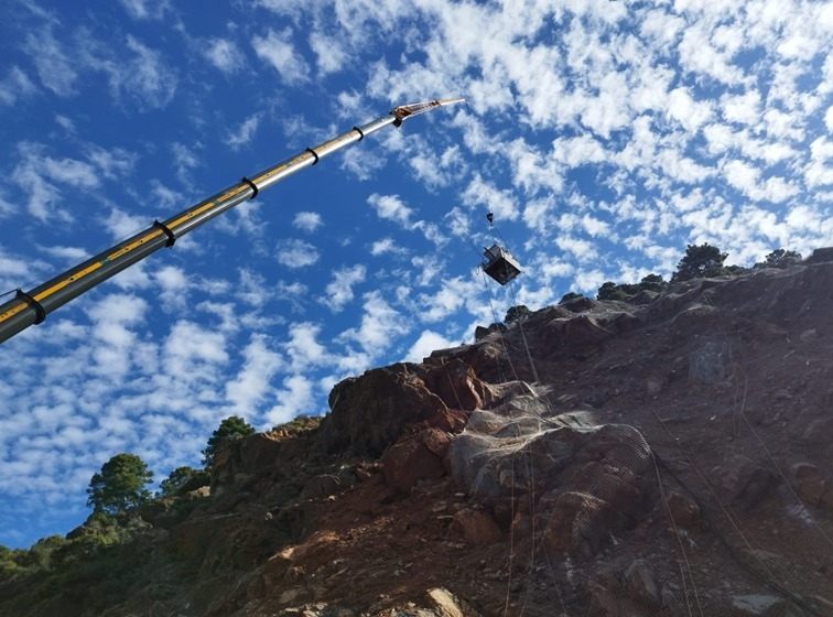 Los trabajos desarrollados hasta ahora se han centrado en la limpieza y retiradas de roca de la zona de cabecera e intermedia del deslizamiento para estabilizar la ladera. Los operarios siguen retirando rocas e instalando la membrana de contención en la zona intermedia, asistidos por una grúa de gran alcance para subir materiales.