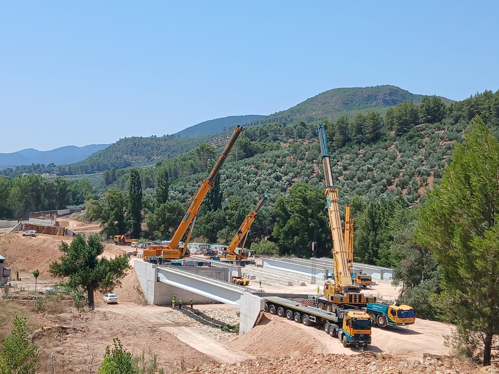 Esta semana se ha procedido a la colocación de las ocho primeras vigas que conforman la estructura sobre el río Orcera, cuya actuación ha finalizado con éxito. Para el izado desde las bancadas y la colocación en los estribos de la primera estructura “ha sido necesario trabajar a la vez con cuatro grúas de gran tonelaje”. Las vigas ya colocadas tienen una longitud de 32 metros para salvar el paso del río, pero también para mejorar la intersección con la carretera de titularidad provincial que sirve de acceso al municipio de Orcera. Al mismo tiempo ya se está desarrollando el proceso de fabricación de las 21 vigas restantes, que tendrán una longitud de 42 metros, para así completar la segunda estructura que permite salvar el río Trujala.