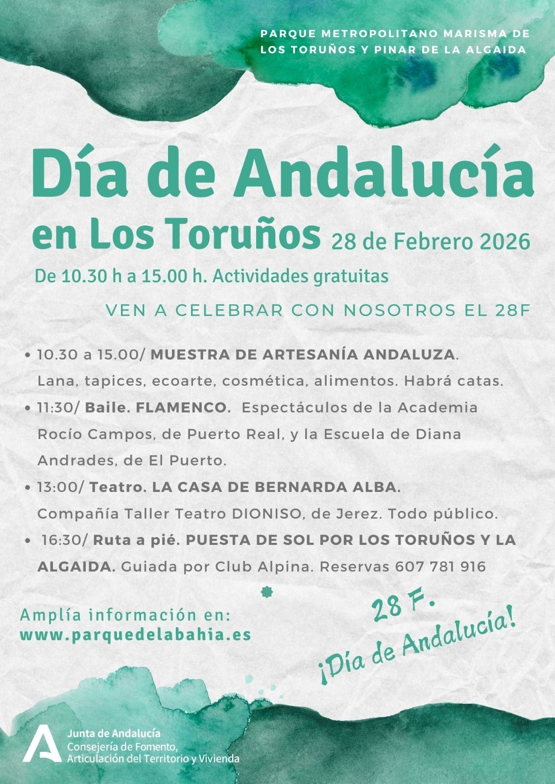 El Parque Metropolitano Marisma de los Toruños y Pinar de la Algaida se suma a las celebraciones del Día de Andalucía con una completa agenda de actividades que ponen en valor la identidad de nuestra tierra. Bajo la organización de la Consejería de Fomento, Articulación del Territorio y Vivienda, como gestora de este espacio natural público, el parque invita a la ciudadanía a un encuentro gratuito que fusiona cultura, tradición y respeto al medio ambiente para el 28 febrero.