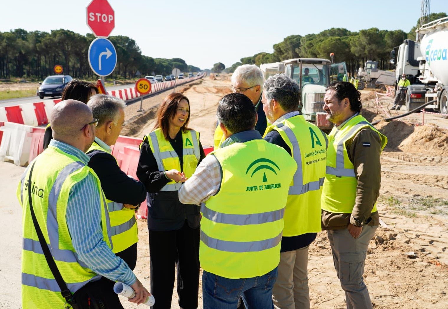 La consejera de Fomento, Articulación del Territorio y Vivienda, Rocío Díaz, ha cursado una visita técnica a las obras de implantación del tercer carril en la carretera A-483, en el tramo de 9,8 kilómetros que conecta Almonte con El Rocío, principal acceso al Parque Nacional de Doñana y a las playas de Huelva. Se trata de una vía con elevado tráfico, especialmente en verano y durante la romería de El Rocío. En la visita también han asistido el alcalde de Almonte, Francisco Bella; el delegado territorial de Fomento, Jaime Pérez, y el vicepresidente 2º de la hermandad matriz de Almonte, José María Sosa.