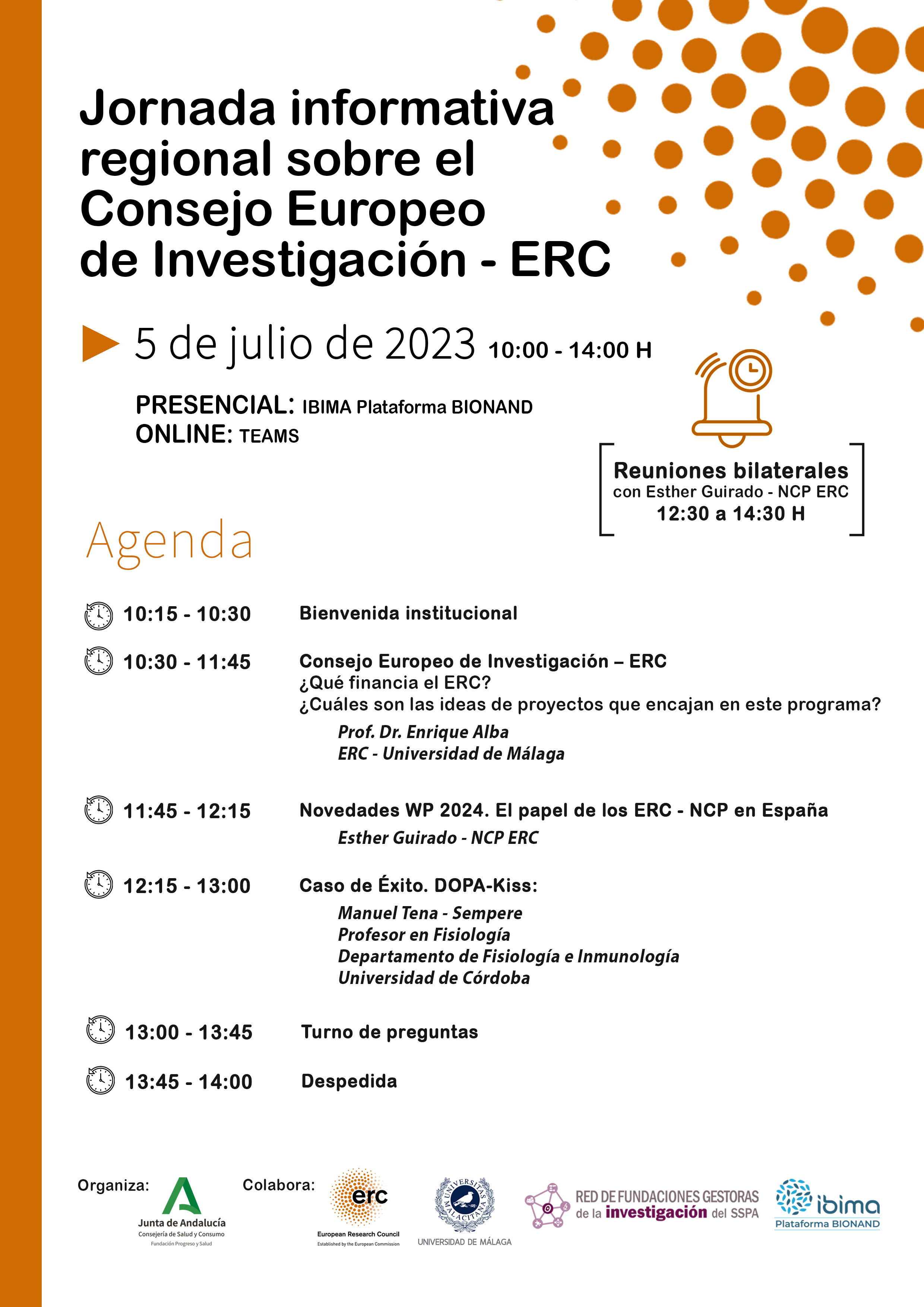 El lunes 5 julio el Salón de Actos de IBIMA Plataforma BIONAND de Málaga acogerá la jornada Informativa regional sobre el Consejo Europeo de Investigación (ERC, por sus siglas en ingles). En las jornadas, Enrique Alba, experto nacional destacado ERC de la Universidad de Málaga, informará sobre qué financian las convocatorias del ERC y qué ideas de proyectos encajan en el programa. Posteriormente, Esther Guirado, NCP del programa ERC y Técnico de la Oficina de Proyectos Internacionales del SSPA, presentará las novedades del programa de trabajo del ERC para 2024 y destacará el papel de las NCP del programa en España. Finalmente, Manuel Tena-Sempere, Profesor de la Universidad de Córdoba, presentará su proyecto como caso de éxito en las convocatorias del ERC. Las personas interesadas, podrán solicitar reuniones bilaterales con la NCP y el experto al finalizar la jornada.
