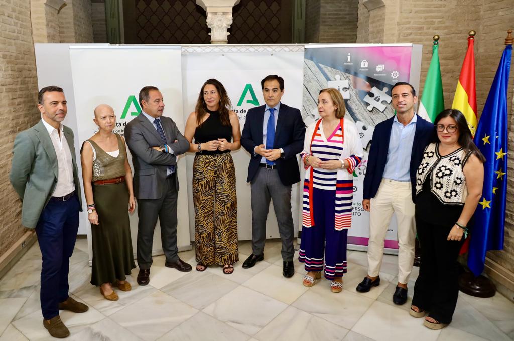 Los consejeros han estado acompañados en la presentación por el delegado del Gobierno de la Junta de Andalucía en Sevilla, Ricardo Sánchez, la viceconsejera de Justicia, Administración Local y Función Pública, Ana María Corredera, la directora del Instituto Andaluz de la Mujer, Olga Carrión, el director general de Justicia Juvenil y Cooperación, Esteban Rondón, la delegada territorial de Inclusión Social, Juventud, Familias e Igualdad, María Luisa Cava, el delegado territorial de Justicia, Administración local y Función Pública en Sevilla, Francisco Javier Millán, y la coordinara provincial del IAM en Sevilla, Mercedes Soriano.