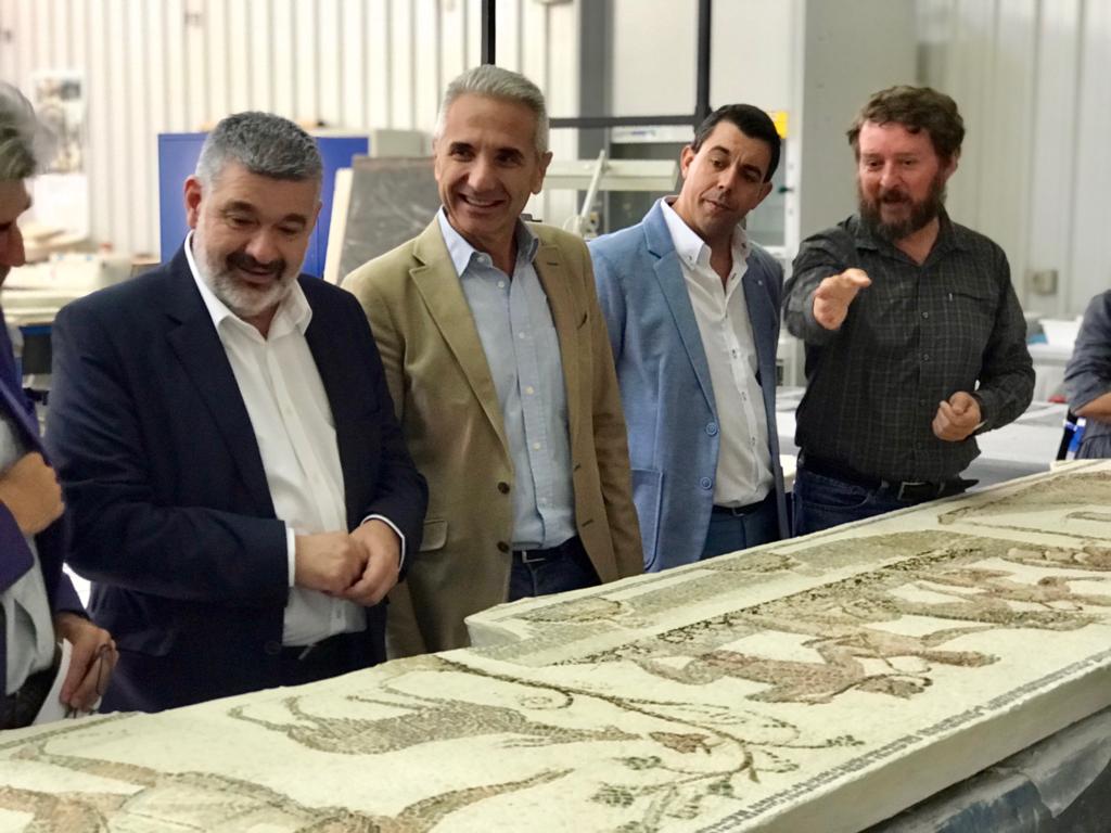 Miguel Ángel Vázquez (segundo por la izquierda) escucha las explicaciones sobre la restauración del mosaico.