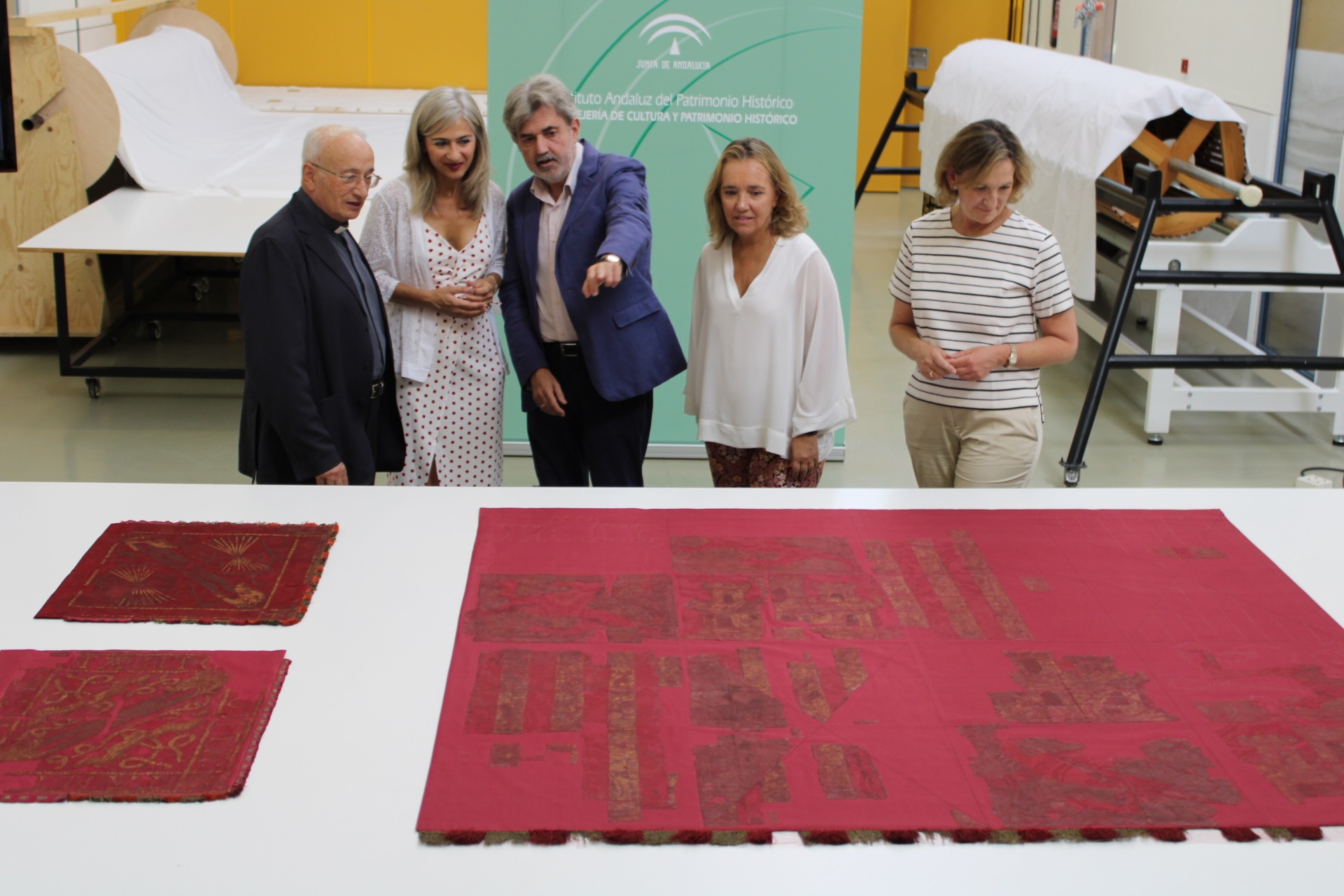La consejera de Cultura y Patrimonio Histórico, Patricia del Pozo, y el Capellán Mayor de la Capilla Real de Granada, Manuel Reyes, han visitado hoy el Instituto Andaluz del Patrimonio Histórico (IAPH) para conocer la restauración de tres banderas pertenecientes a la colección textil del Museo de la Capilla Real: el Estandarte de Caballería de los Reyes Católicos o Pendón Real, el Guion Real con la divisa personal de Fernando, también llamado de los yugos, y Guion Real con la divisa personal de Isabel, conocido como de las flechas.