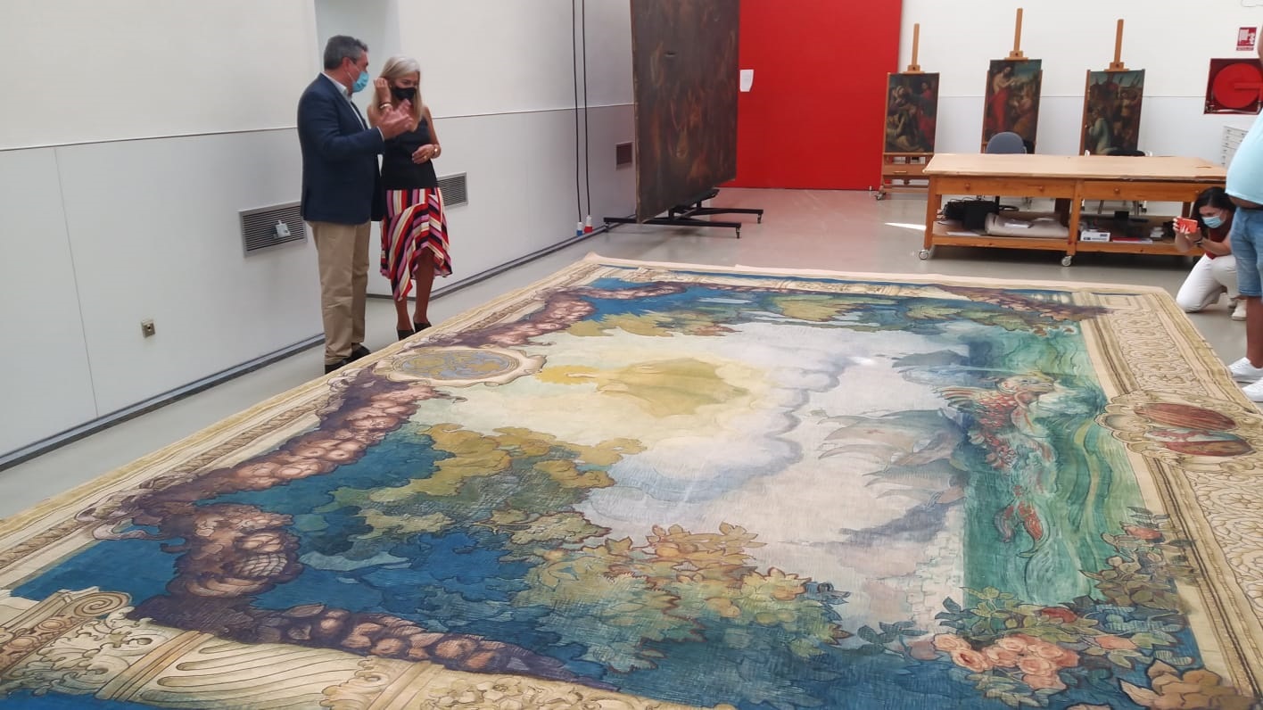 Del Pozo visita en el taller de tejidos del IAPH las sargas de la colección de Gustavo Bacarisas