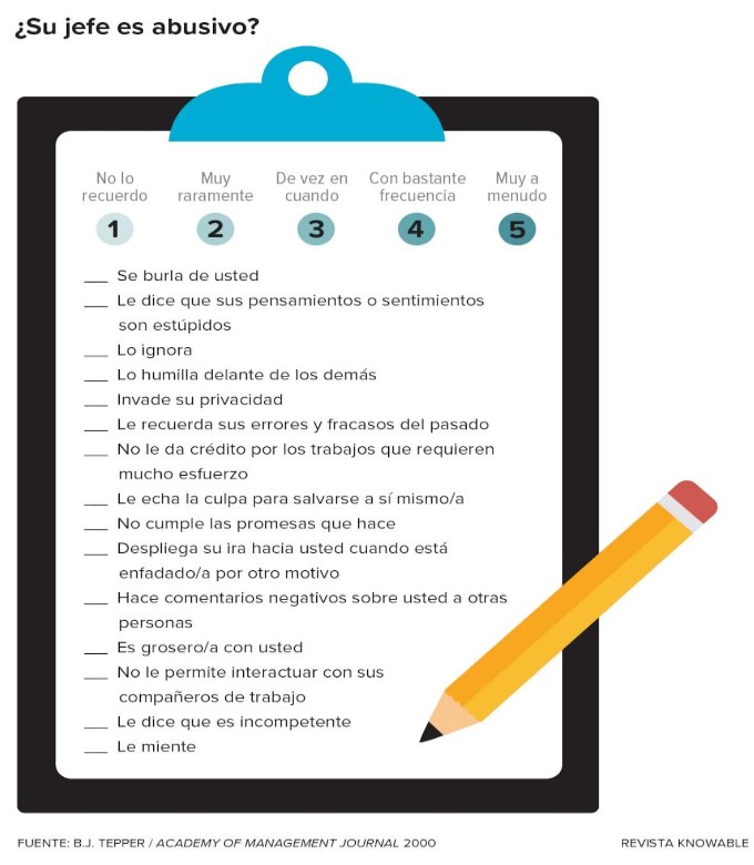 Se dispone de algunas herramientas para identificar este tipo de situaciones técnicamente. Sería el caso de Bennett Tepper (Fisher College of Business de la Universidad Estatal de Ohio en Columbus), autor del término supervisión abusiva en 2000, que elaboró una lista de 15 puntos. A partir de él se evalúan las experiencias de las personas empleadas, sobre todo en el sector servicios (ventas, tecnología, educación y servicios de salud), de manera que si se da una respuesta positiva a 3 o más de esos ítems o puntos, se entiende que se sufre una jefatura tóxica o abusiva. Conviene distinguir, en todo caso, “malas jefaturas” de jefaturas tóxicas o abusivas. Las primeras son más frecuentes, las segundas más reducidas, entre un 10% y un 15%, según diferentes estudios (serio, otros menos fiables los elevan en exceso, confundiendo conceptos) y parece mantenerse estable la cifra.
