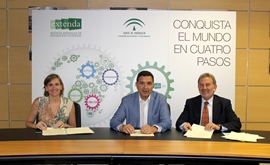El director general de la Agencia de Innovación y Desarrollo de Andalucía, IDEA, Antonio González Marín y la consejera delegada de Extenda-Agencia Andaluza de Promoción Exterior, Vanessa Bernad, han firmado un acuerdo de colaboración para el desarrollo de actividades conjuntas que logren incrementar la atracción de inversión directa nacional e internacional a Andalucía. El objetivo de este acuerdo, rubricado en presencia del secretario general de Economía y presidente de Extenda, Gaspar Llanes, es sumar los esfuerzos de ambas entidades para llegar a más empresas, impulsando de esta forma, un trabajo común que viene desarrollándose desde 2010.