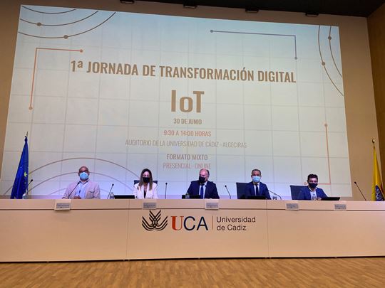 Esta jornada permitirá dar a conocer a las empresas del Campo de Gibraltar las oportunidades que conllevan las aplicaciones tecnológicas en términos de productividad, sostenibilidad y ciberseguridad. En la inauguración del evento, han participado además el alcalde de Algeciras, José Ignacio Landaluce, la vicerrectora del Campus Bahía de Algeciras, María del Mar Cerbán, el director digital de Cepsa, Joaquín Abril-Martorell, el presidente de la Cámara de Comercio del Campo de Gibraltar, Carlos Fenoy, y el director de la Autoridad Portuaria de la Bahía de Algeciras, José Luis Hornachuelas.