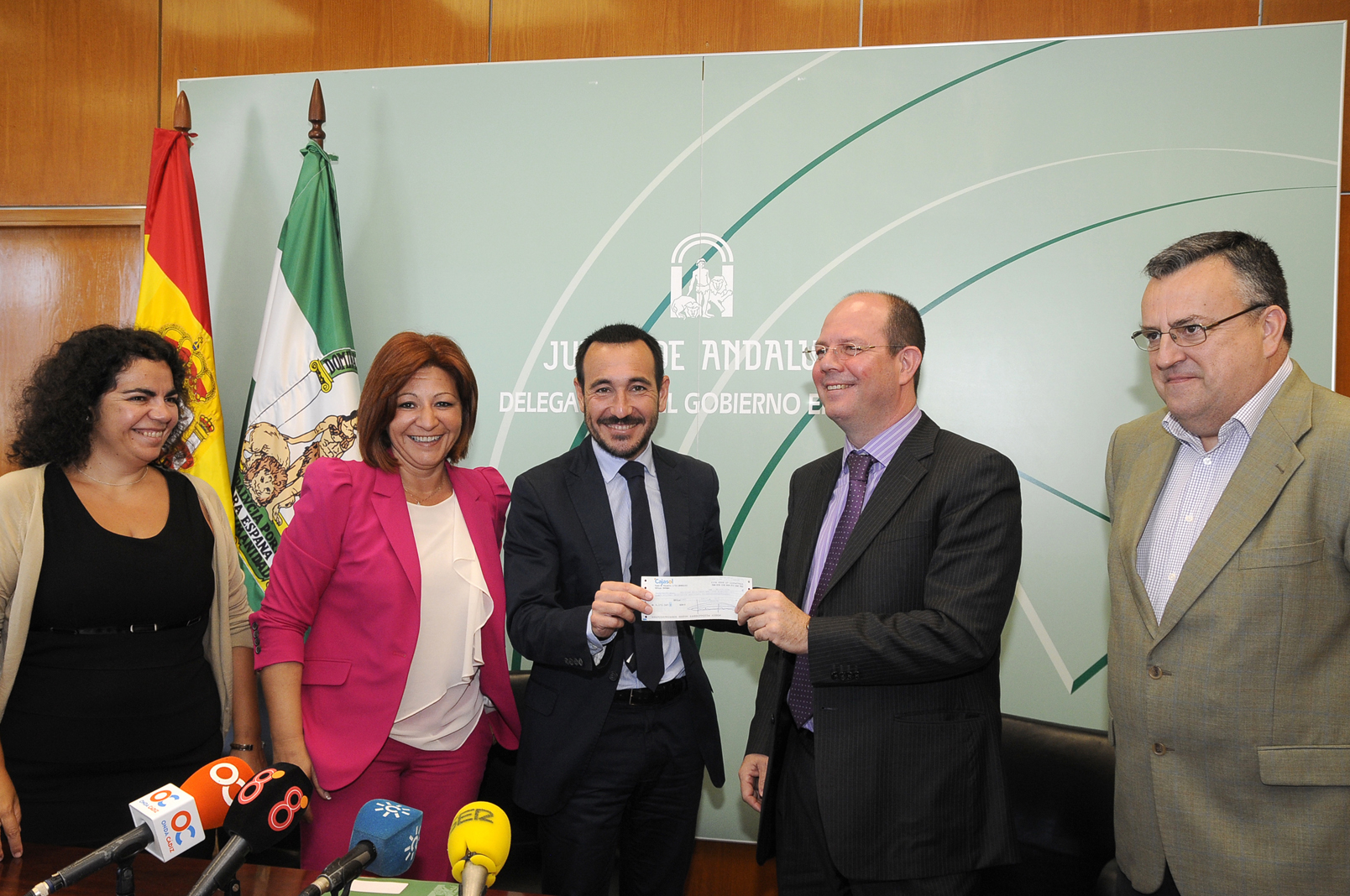 De izquierda a derecha, Rosa Mellado, gerente de la Agencia IDEA; Angelines Ortiz, delegada territorial de Economía; Fernando López Gil, delegado del Gobierno de la Junta en Cádiz; Jorge Alonso, presidente del Grupo Alonso y Ángel Gavino, subdelegado del Gobierno de la Junta en el Campo de Gibraltar durante la entrega del incentivo.