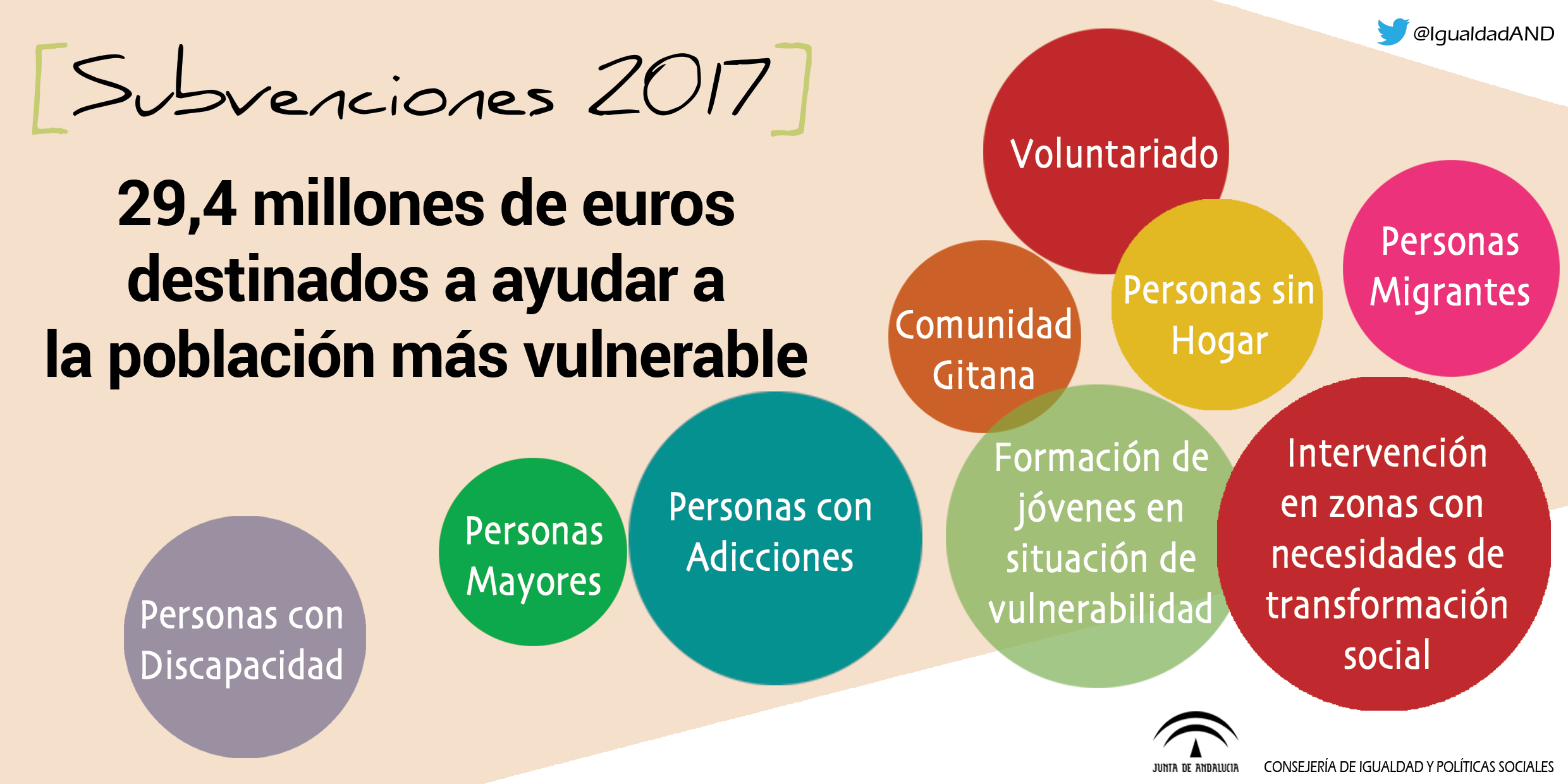 Sánchez Rubio ha informado que el Boletín Oficial de la Junta de Andalucía (BOJA) ha publicado ya la primera convocatoria de estas subvenciones (www.juntadeandalucia.es/boja/2017/54/1) que asciende a más de 17,2 millones de euros y se dirigen a entidades públicas y privadas y a personas y colectivos que precisan de una prestación o programa para cubrir sus necesidades específicas.