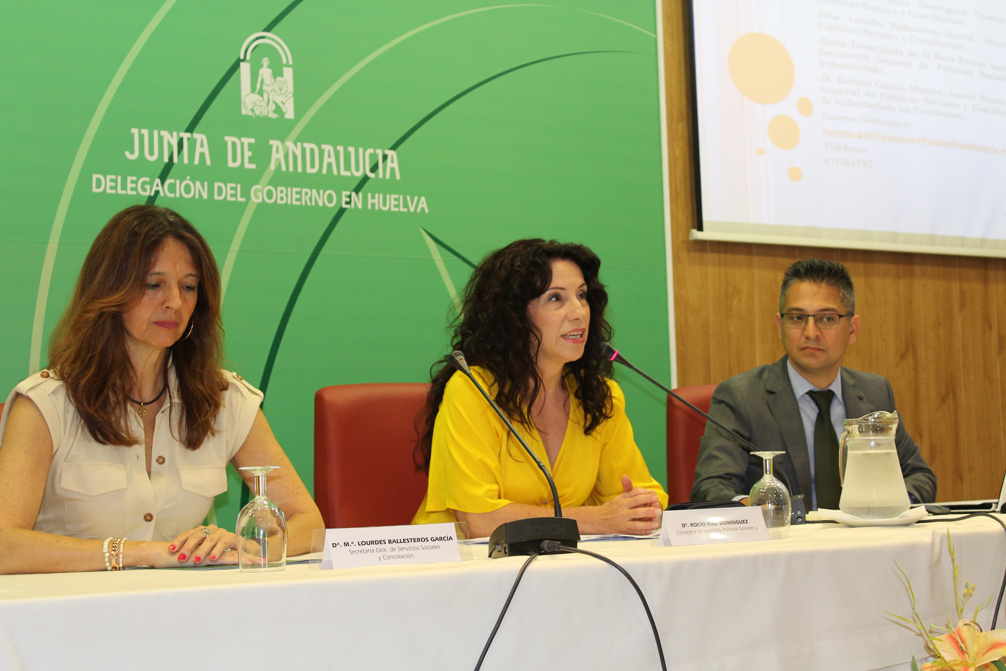 Al acto han asistido también: la secretaria general de Servicios Sociales y Conciliación, María Lourdes Ballesteros García; la delegada territorial de Educación, Deporte, Igualdad, Políticas Sociales y Conciliación en Huelva, María Estela Villalba Valdayo; y los asesores técnicos de la Secretaría General de Servicios Sociales y Conciliación Ramón García Montes e Inmaculada de la Rosa Porras.
