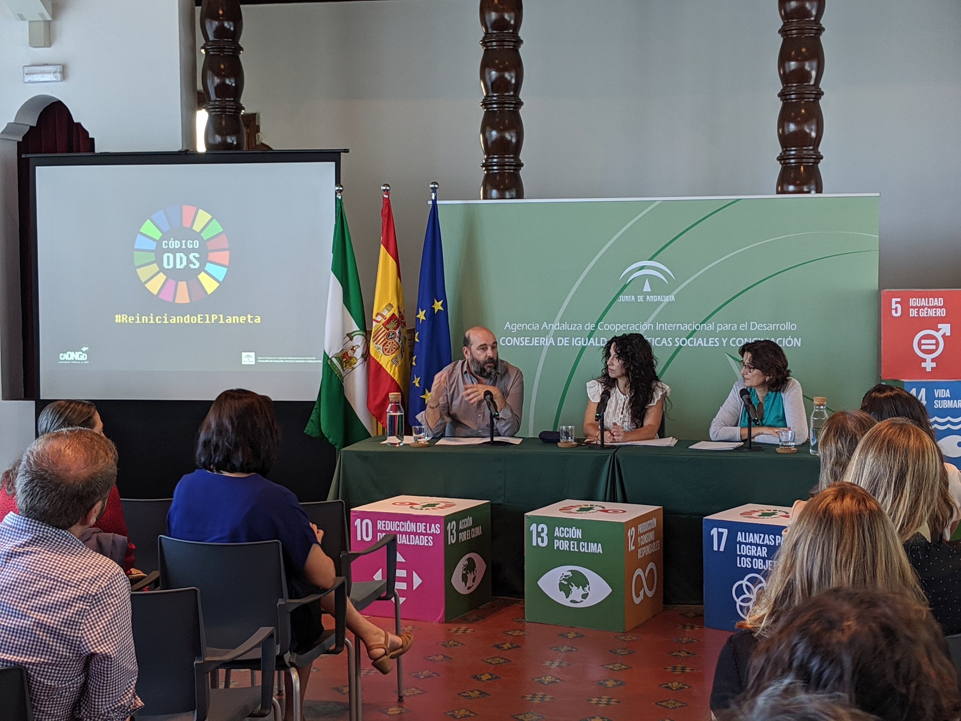 La consejera de Igualdad, Políticas Sociales y Conciliación, Rocío Ruiz, en su calidad de presidenta de la Agencia Andaluza de Cooperación Internacional para el Desarrollo (AACID); y Héctor Rivero, presidente de la Coordinadora Andaluza de ONG de Desarrollo (CAONGD), han presentado hoy en la sede de la AACID la campaña “#CódigoODS: Reiniciando el planeta”.