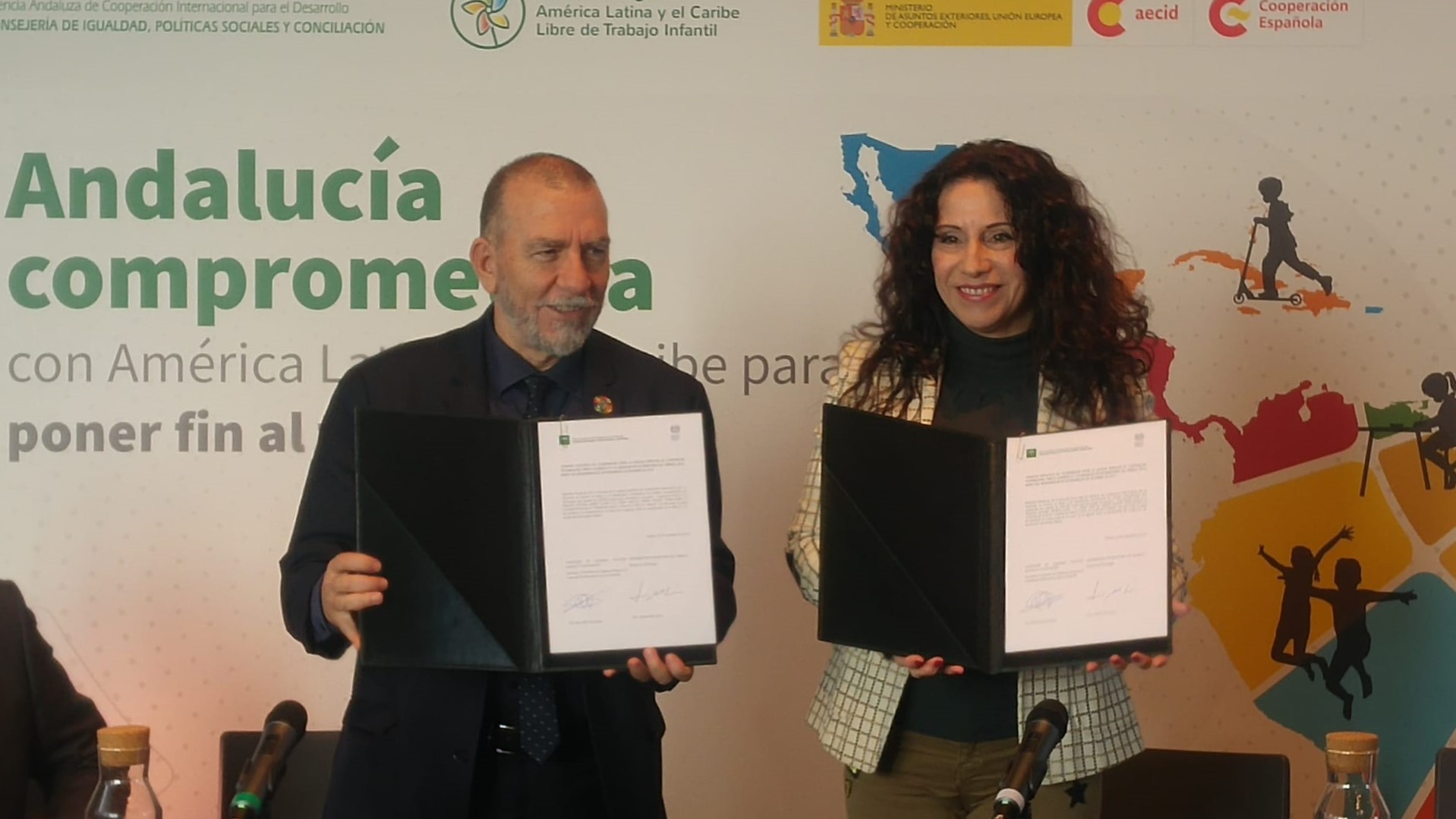 La consejera de Igualdad, Políticas Sociales y Conciliación, Rocío Ruiz, y el director de la Oficina en España de la Organización Internacional del Trabajo (OIT), Joaquín Nieto, han firmado un acuerdo de colaboración entre la Agencia Andaluza de Cooperación Internacional para el Desarrollo (AACID) y la entidad internacional para el desarrollo de estrategias contra el trabajo infantil en América Latina y el Caribe que tiene un alcance de hasta treinta países en total. De esta forma, la Agencia renueva su compromiso con una aportación de 350.000 euros destinada a la Iniciativa Regional América Latina y el Caribe Libre de Trabajo Infantil para el periodo 2020-2021, cuya Secretaría Técnica recae en la Oficina Regional de la OIT.