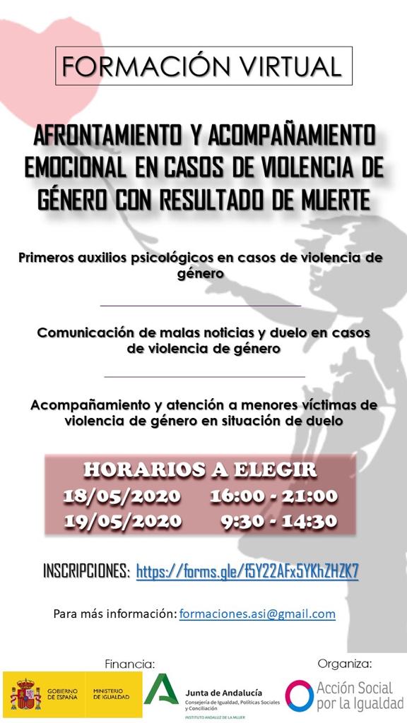 El Instituto Andaluz de la Mujer (IAM) pone en marcha una formación online sobre el ‘Afrontamiento y Acompañamiento emocional en casos de violencia de género con resultado de muerte’. Este curso es muy especializado y está dirigido al personal técnico que atiende a los menores tras el asesinato de sus madres. La formación se realizará en dos jornadas formativas, el lunes 18 y martes 19 de mayo, una en horario de tarde y otra de mañana de cinco horas de duración cada una. A las personas participantes que concluyan satisfactoriamente la formación, se les expedirá un certificado acreditativo.