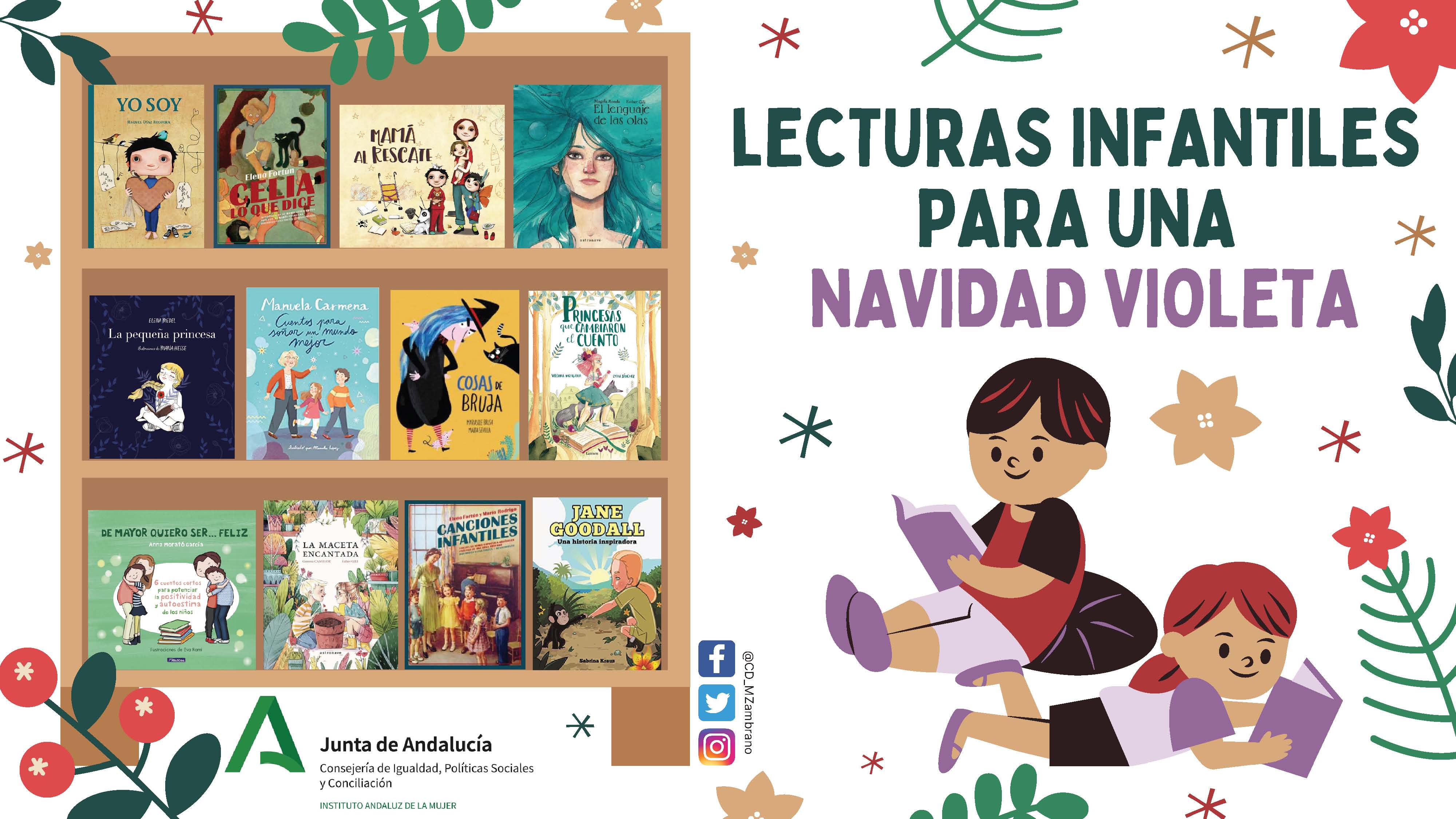 El Instituto Andaluz de la Mujer (IAM) lanza la guía ‘Lecturas infantiles para una Navidad violeta’ dirigida a la población infantil y juvenil de Andalucía coincidiendo con las vacaciones escolares. El Centro de Documentación María Zambrano, que viene elaborando este tipo de publicaciones desde 2014 en torno a fechas y temas concretos, ha realizado una selección de 12 cuentos para niñas y niños de hasta 14 años de edad con un trasfondo de respeto a la diversidad y de promoción de valores como la igualdad de género. Todos los libros se encuentran a disposición del público en el Centro de Documentación María Zambrano, sito en la calle Alfonso XII, 52.