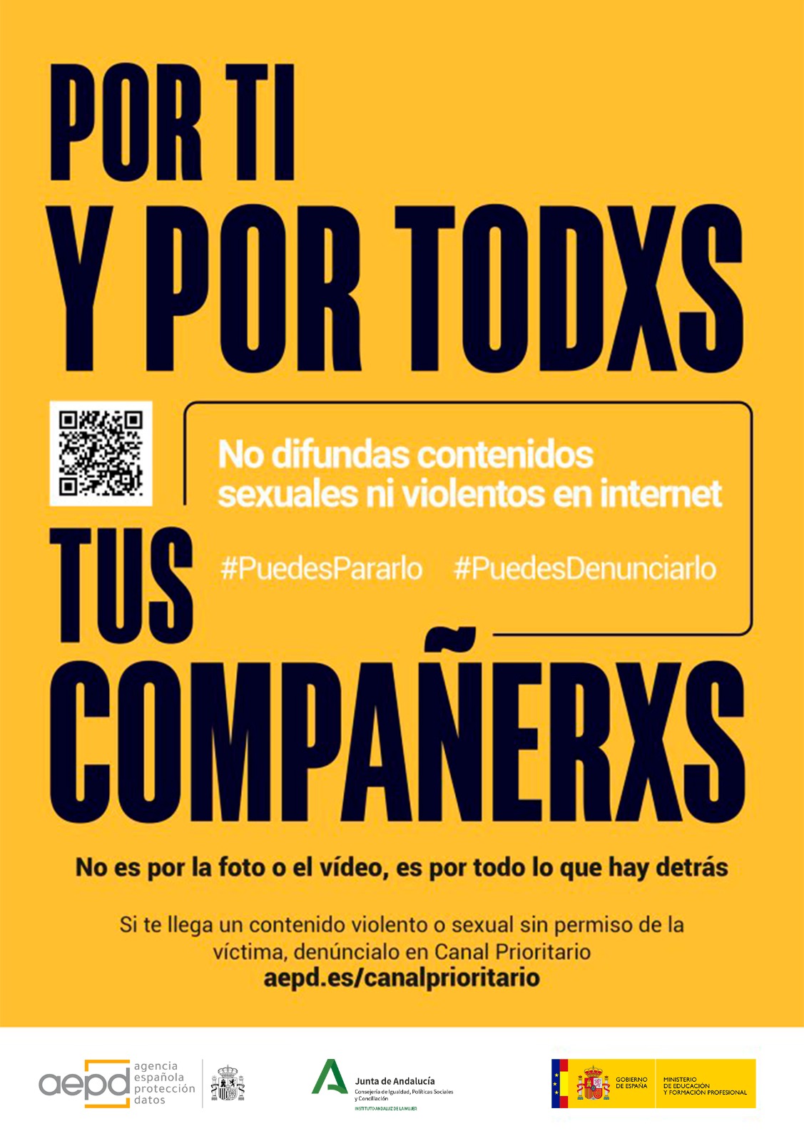 En este contexto, el Canal Prioritario -https://www.aepd.es/canalprioritario/- que promociona y visibiliza la Consejería de Igualdad, Políticas Sociales y Conciliación con esta campaña, es un instrumento específico para la atención prioritaria y detención de la difusión masiva de este tipo de contenidos en la red. Este canal se ha habilitado para la atención de situaciones excepcionalmente delicadas, cuando los contenidos que tengan carácter sexual o muestren actos de agresión y se estén poniendo en alto riesgo los derechos y libertades de los afectadas. Y aunque a este canal puede acudir cualquier persona afectada por este tipo de ciberviolencias, del mismo modo puede ser utilizado por cualquier persona que tenga conocimiento de dicha difusión.