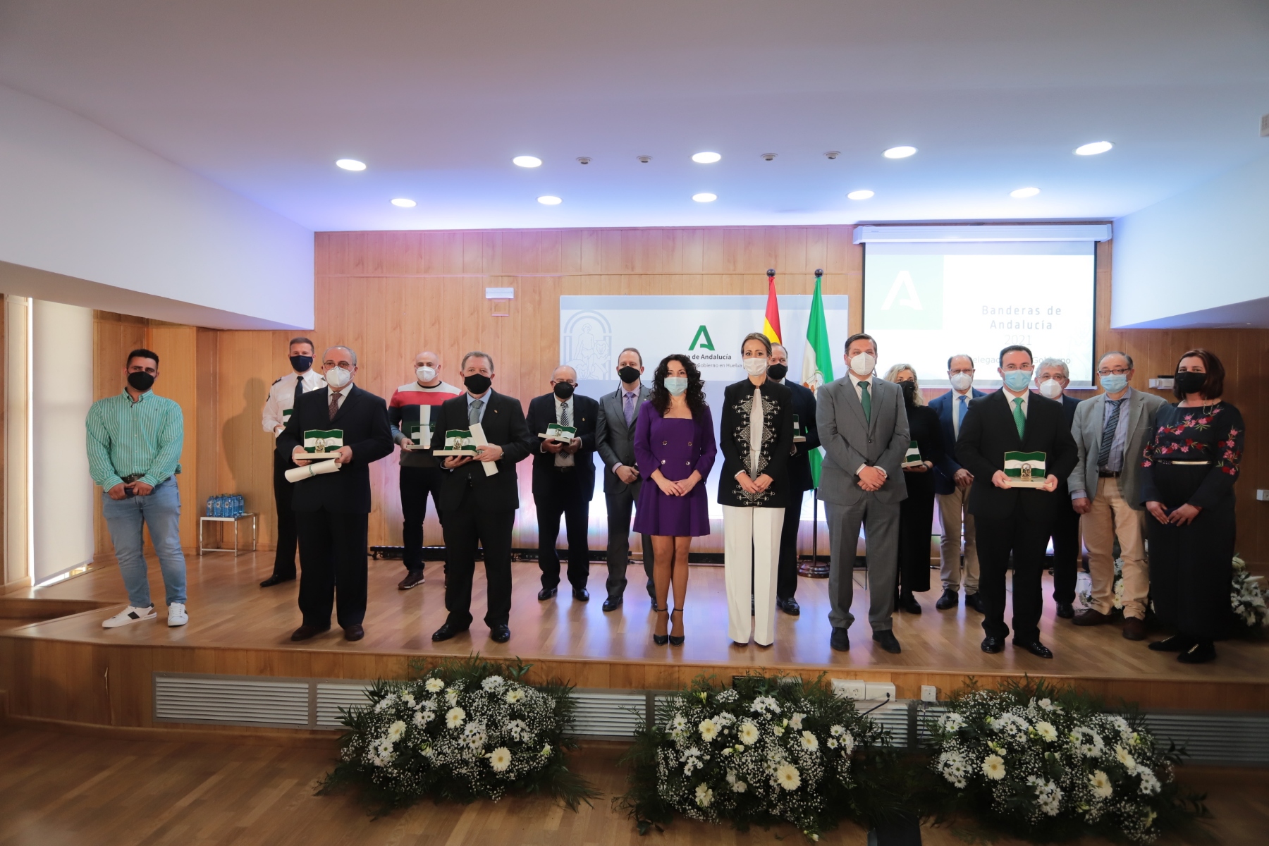 La Bandera de la Solidaridad y la Concordia ha recaído en las Agrupaciones de Protección Civil de Huelva por su trayectoria y, en especial, por la colaboración prestada desde la declaración de la emergencia sanitaria en el reparto de material de protección a las residencias de personas mayores, servicio de ayuda a domicilio, ayuntamientos, etcétera. Asimismo, el premio al Mérito Medioambiental, al voluntariado representado por la Asociación Aldeas Unidas, la Plataforma Huelva Resilente y Juan Luis Esquina García por su ayuda y colaboración en la extinción y restauración de los daños del incendio en Almonaster la Real que tuvo lugar el pasado mes de agosto. Y, en el caso de los Valores Humanos, a la Asociación de Vecinos ‘La Hispanidad’ por su labor social.