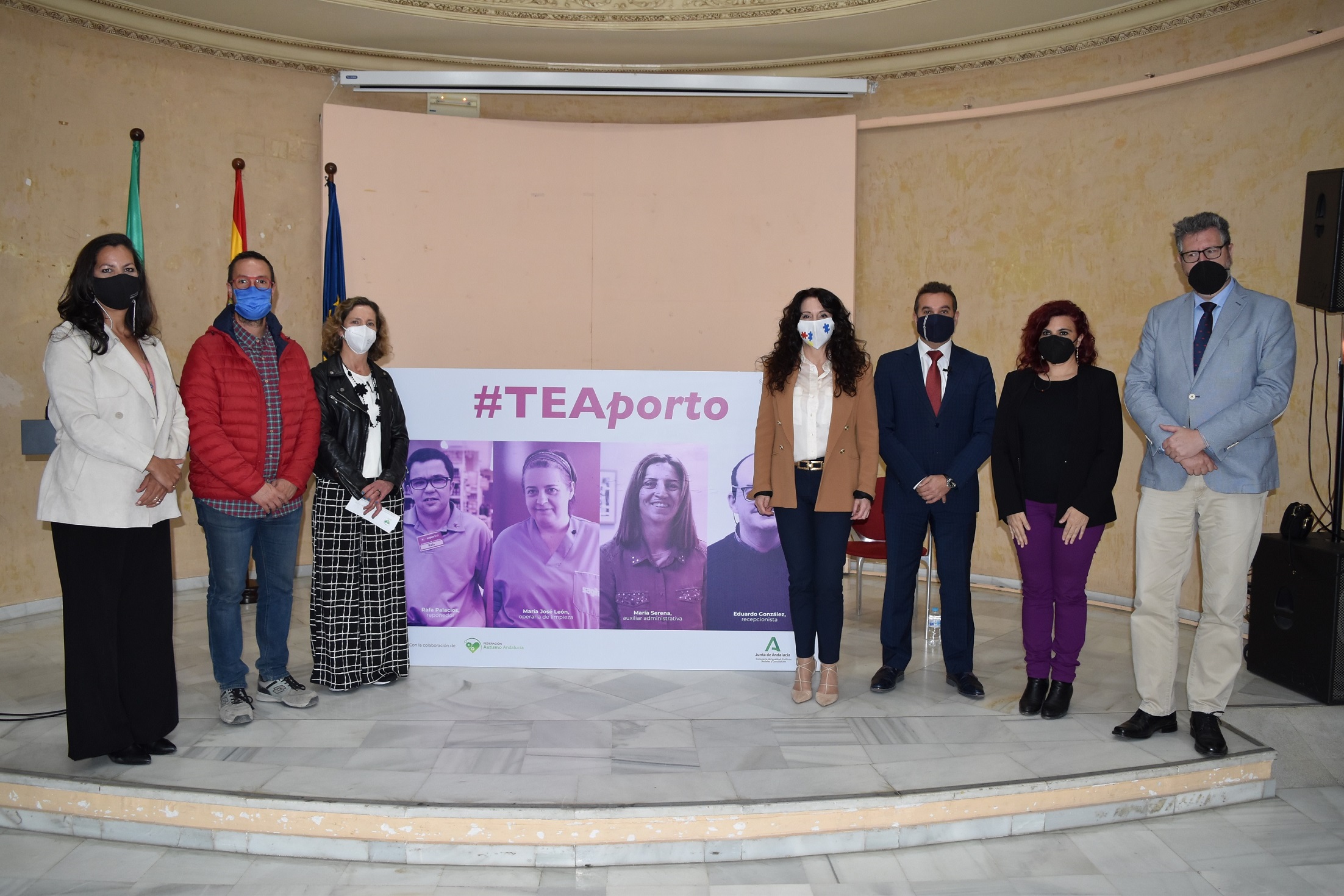 Durante el acto de presentación de la campaña #TEAporto, la consejera ha estado acompañada por el director general de Personas con Discapacidad e Inclusión, Marcial Gómez; el delegado territorial de la Consejería en Huelva, Manuel Antonio Conde; y la presidenta de la Federación Autismo Andalucía, Mercedes Molina.