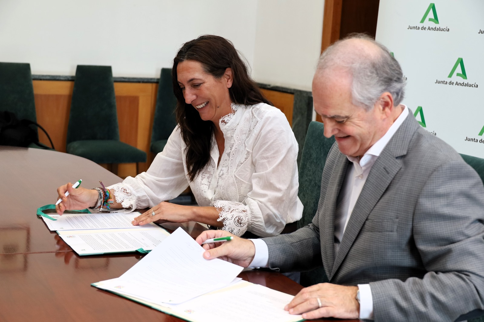 La consejera de Inclusión Social, Juventud, Familias e Igualdad, Loles López, y el presidente del Consejo Andaluz de Colegios Oficiales de Farmacéuticos, Antonio Mingorance, han firmado esta semana un convenio de colaboración para reconocer a las farmacias como espacios seguros para las víctimas de violencia de género. Este reconocimiento se materializará con un distintivo en el establecimiento y, a través de un producto clave, las mujeres que lo precisen podrán solicitar ayuda al personal farmacéutico, el cual dará la alerta a los servicios de emergencia 112.