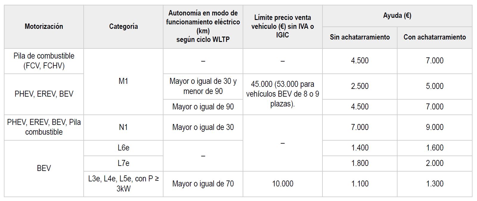 Tabla de ayudas por tipo de vehículo para particulares, autónomos y entidades públicas