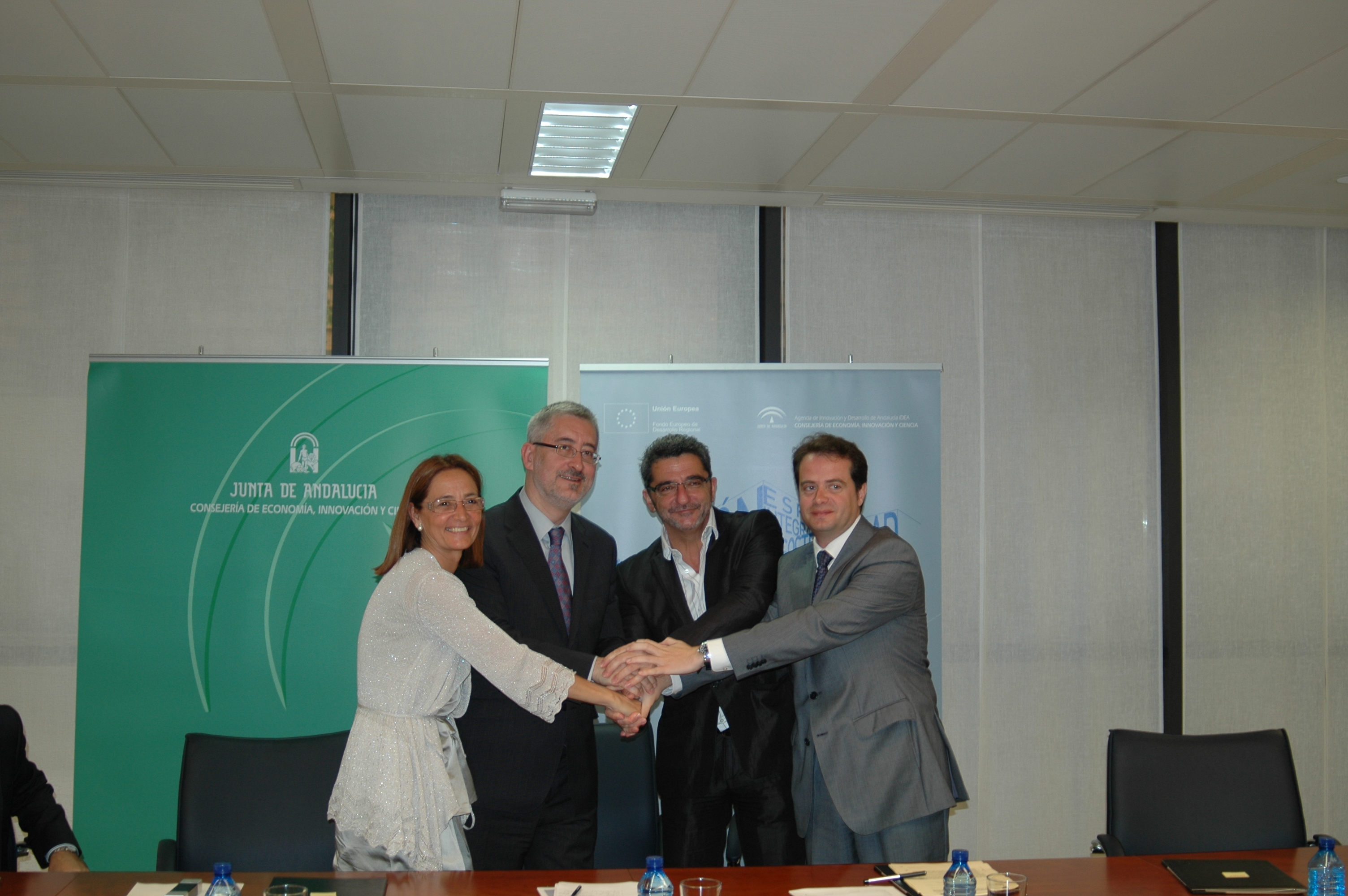 El consejero de Economía, Innovación y Ciencia, Antonio Ávila, y los alcaldes de los municipios de Mairena del Aljarafe, Antonio Conde; Lebrija, Mª José Fernández; y Alcalá de Guadaira, Antonio Gutiérrez Limones, han formalizado hoy los convenios por los que se pone a disposición de los empresarios locales un total de 79 naves con una superficie conjunta de más de 23.500 metros cuadrados en el marco del Programa de Actuaciones Conjuntas de Naves Industriales en Espacios Productivos.