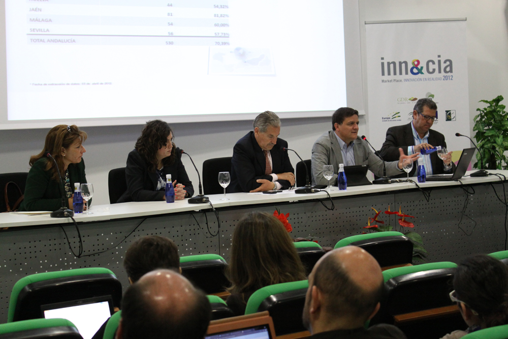 La directora general de Servicios Tecnológicos y Sociedad de la Información, Eva Piñar; la delegada provincial de la Consejería de Economía, Innovación y Ciencia, Angelines Ortiz; el delegado de Impulso Económico del Ayuntamiento de Jerez, Francisco Cáliz; y el gerente de EPICSA, Francisco Vázquez, han inaugurado hoy junto al director general del Consorcio Fernando de los Ríos, Juan Francisco Delgado, la primera jornada provincial “Inn&cia 2012”. Esta jornada ha reunido en el Parque Tecnológico Agroindustrial de Jerez a una docena de expertos y líderes en la creación de proyectos de innovación social, con el objetivo de potenciar nuevas iniciativas que se materialicen en proyectos que enriquezcan el territorio.