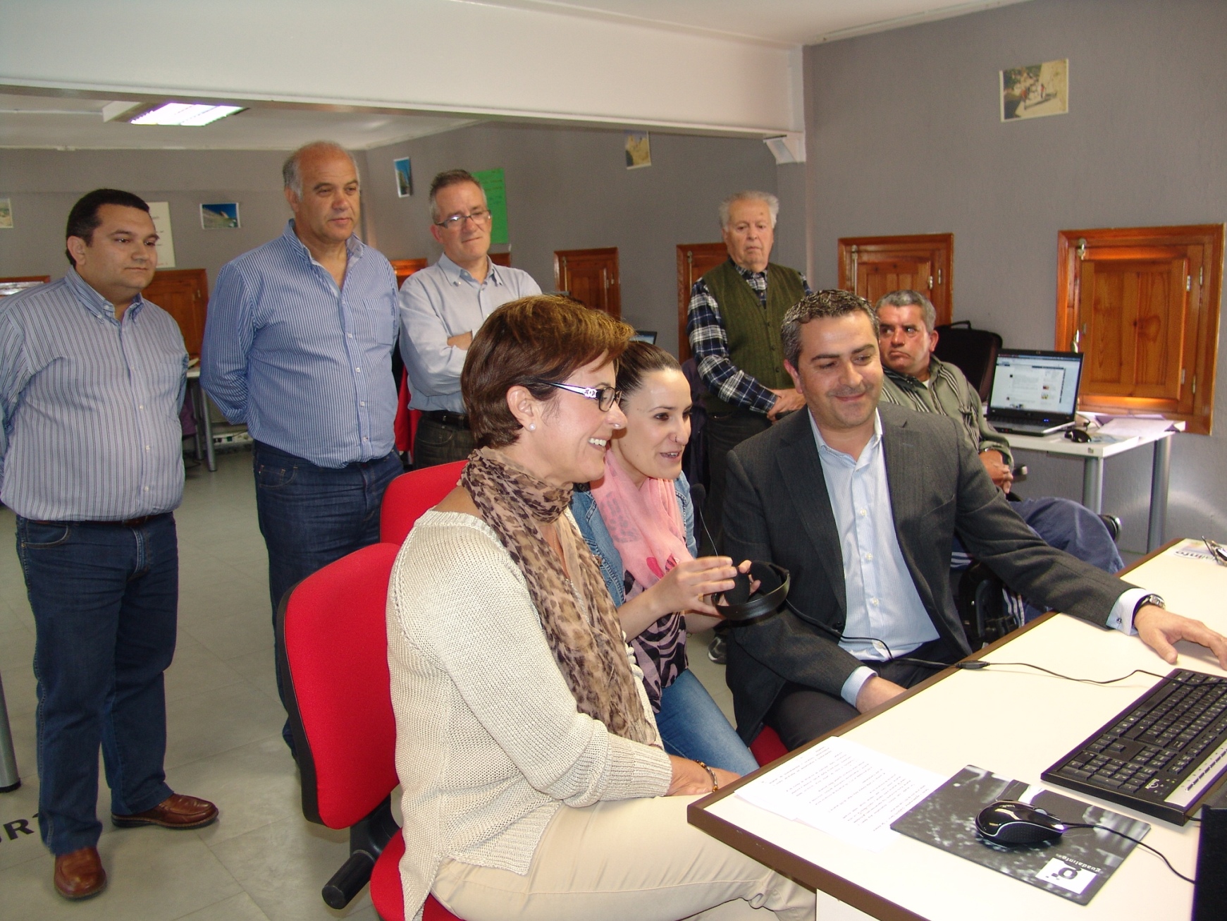 La delegada territorial de Economía, Innovación, Ciencia y Empleo, el alcalde de Serón, y la dinamizadora del centro Guadalinfo de Serón, junto a técnicos de Guadalinfo, concejal y usuarios.