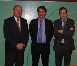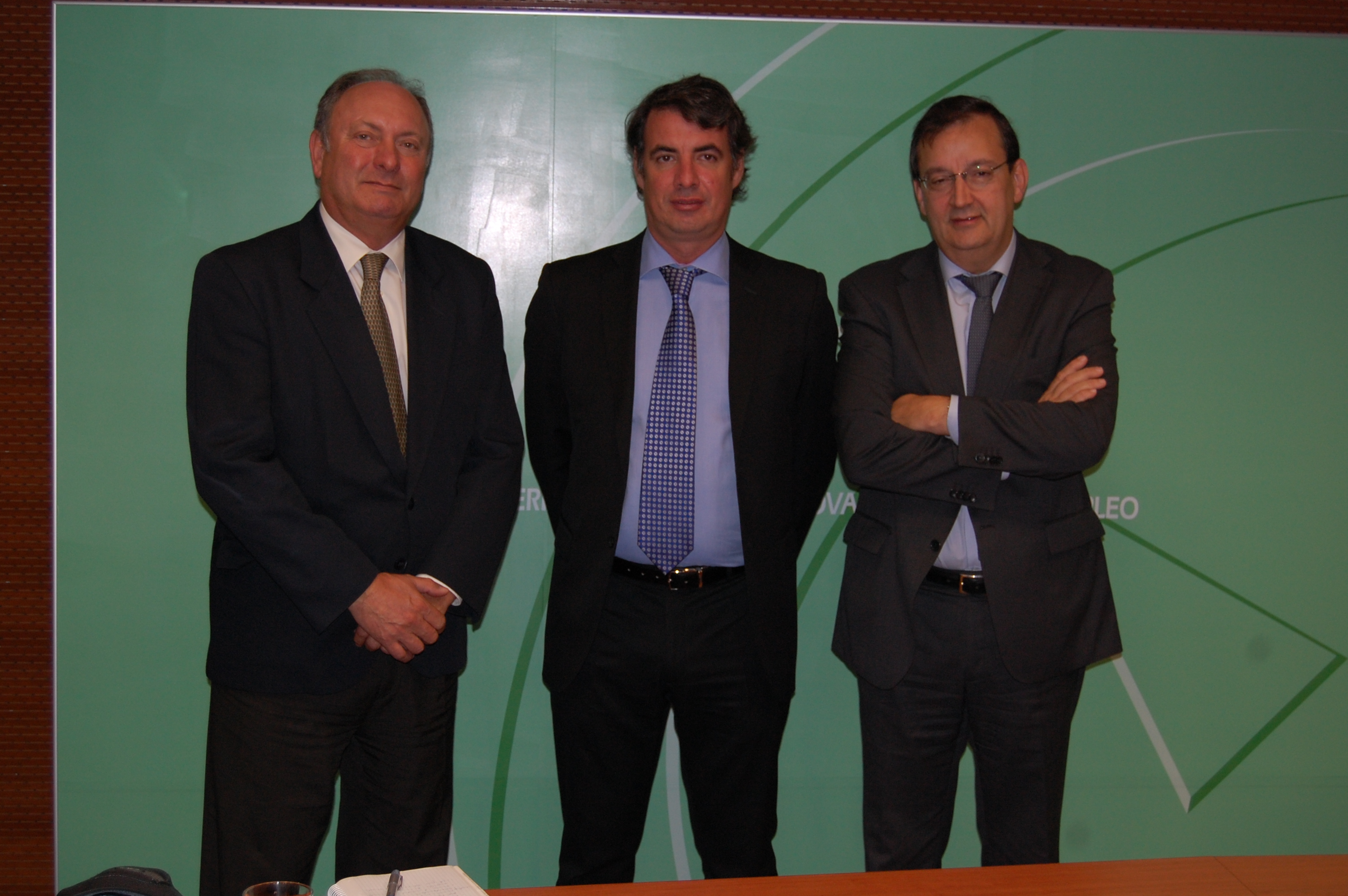 El secretario general de Innovación, Vicente Fernández, acompañado por el presidente de la Federación Empresarial de la Industria Química Española (FEIQUE), Luis Serrano y el presidente de la onubense Asociación de Industrias Químicas, Básicas y Energéticas (AIQBEE), Rafael Martínez-Cañavate.