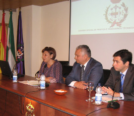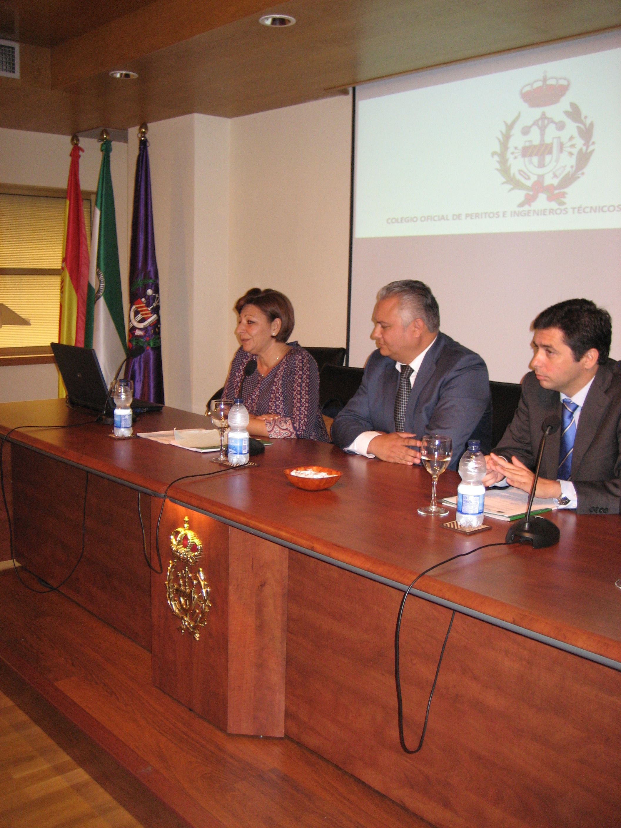 De izquierda a derecha en la mesa, la delegada de Economía, Angelines Ortiz; el decano del Colegio de Ingenieros Técnicos de Cádiz, Domingo Villero; y el director general de la Agencia Andaluza de la Energía, Rafael Márquez, durante la presentación de las jornadas.