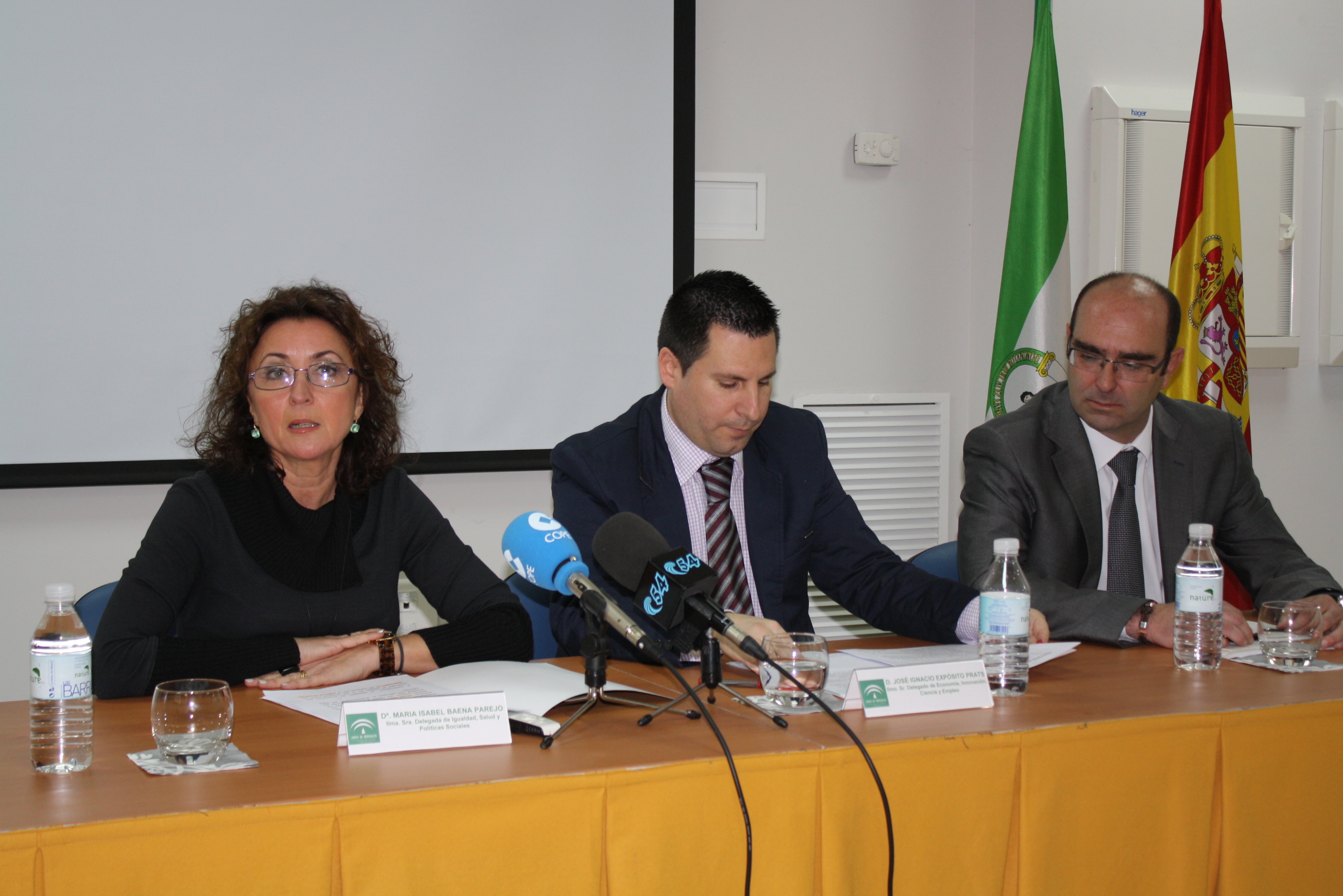 La delegada de Igualda, Salud y Polítcias Sociales, Isabel Baena, el delegado de Economía, Innovación, Ciencia y Empleo, José Ignacio Expósito y el Director Gerente del Área Sanitaria Área Norte de Córdoba, José Antonio Ruiz, en presentación proyecto de ahorro energético en Hospital Valle de Los Pedroches.