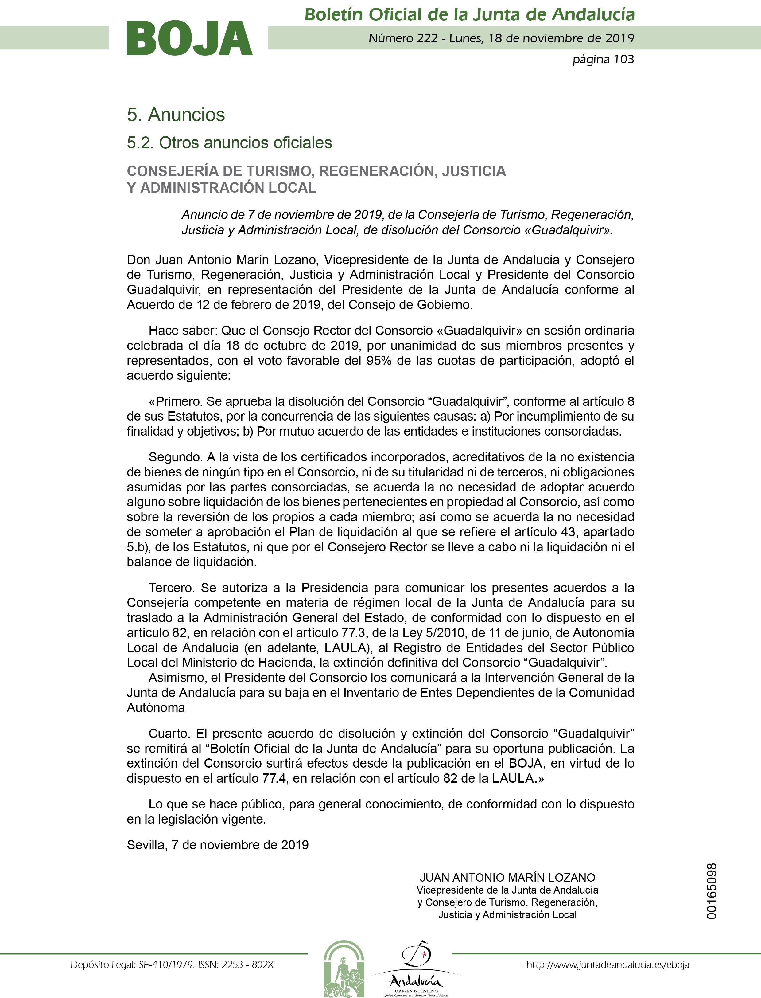 El Boletín Oficial de la Junta de Andalucía (BOJA) ha publicado hoy el acuerdo por el que se procede a la disolución definitiva del Consorcio Guadalquivir. La liquidación de este ente se produce, conforme al artículo ocho de sus Estatutos, por incumplimiento de su finalidad y objetivos y tras el acuerdo de las instituciones y entidades que formaban parte del consorcio.