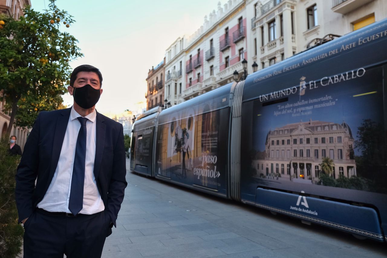 Juan Marín junto al tranvía vinilado con la nueva campaña de la REAAE en el centro de Sevilla