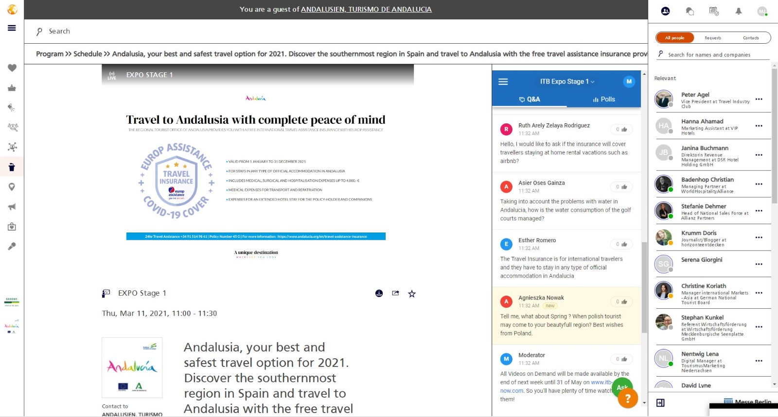 Alrededor de 300 profesionales internacionales han participado hoy en la ponencia sobre la oferta de Andalucía que la Consejería de Turismo ha ofrecido en el marco de la celebración virtual de la Bolsa Internacional de Turismo de Berlín, ITB Now 2021.