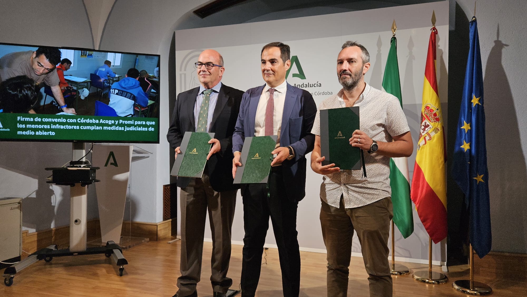 El consejero de Justicia, Administración Local y Función Pública, José Antonio Nieto, ha firmado hoy sendos convenios con los responsables de Córdoba Acoge y Fundación Promi para que los menores infractores a los que los jueces les imponen medidas no privativas de libertad, tales como prestaciones en beneficio de la comunidad y tareas socioeducativas, cumplan estas colaborando con la labor que realizan ambas ONG.