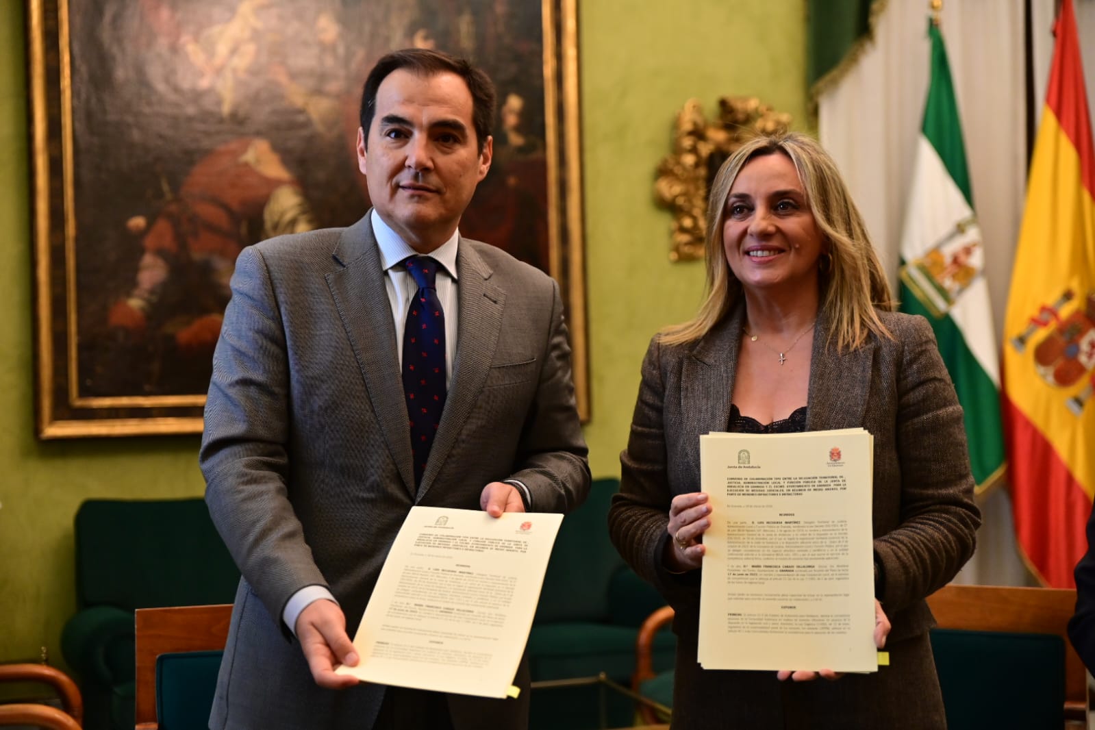 El consejero de Justicia, Administración Local y Función Pública, José Antonio Nieto, y la alcaldesa de Granada, Marifrán Carazo, han firmado hoy un convenio de colaboración entre ambas administraciones para que los menores infractores cumplan medidas judiciales como prestaciones en beneficio de la comunidad y tareas socioeducativas en servicios municipales, así como para que la Policía Local supervise la libertad vigilada y estancias de fin de semana con las familias de estos jóvenes.