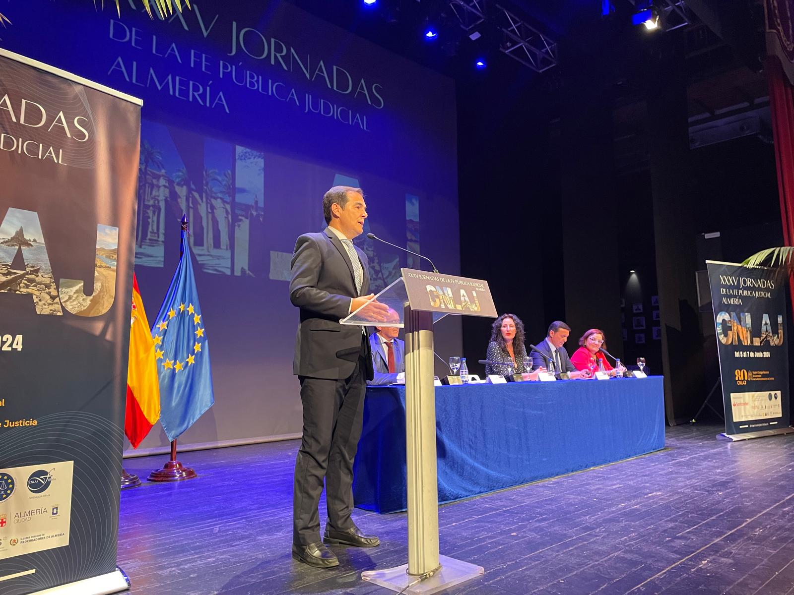Nieto ha participado en la apertura de las XXXV Jornadas de la Fe Pública Judicial, “uno de los grandes congresos de Justicia que se hacen en este país”, organizadas por el Colegio Nacional de LAJ en su 80 aniversario y que reúne en Almería a 300 profesionales de toda España.